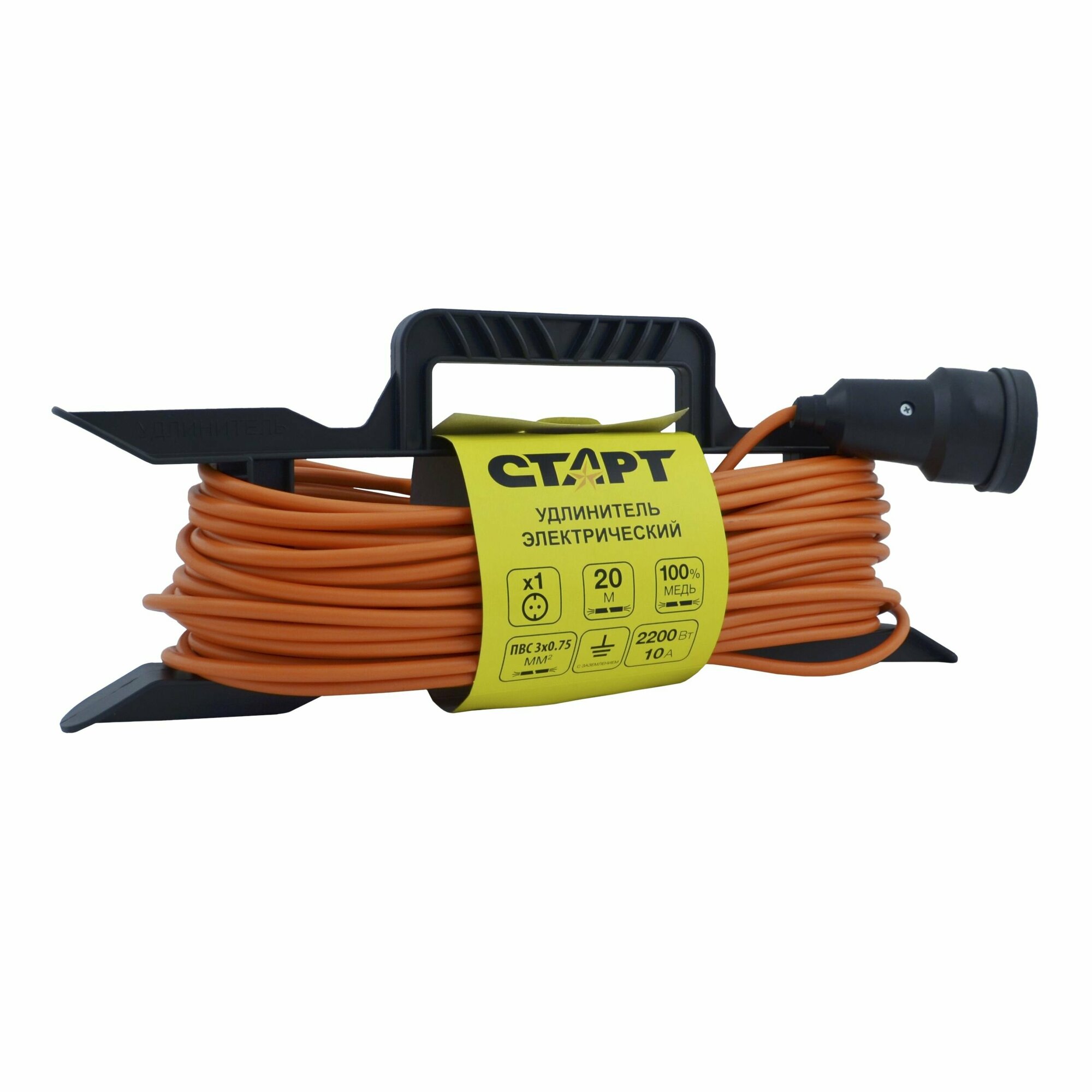 Удлинитель-шнур СТАРТ С/УД SG1х20-Z с проводом 20 м на рамке и заземлением, используется для подключения к сети устройств мощностью до 2200 Вт на значительном расстоянии от розетки. Универсален, подходит для использования в любых помещениях с большой площадью.