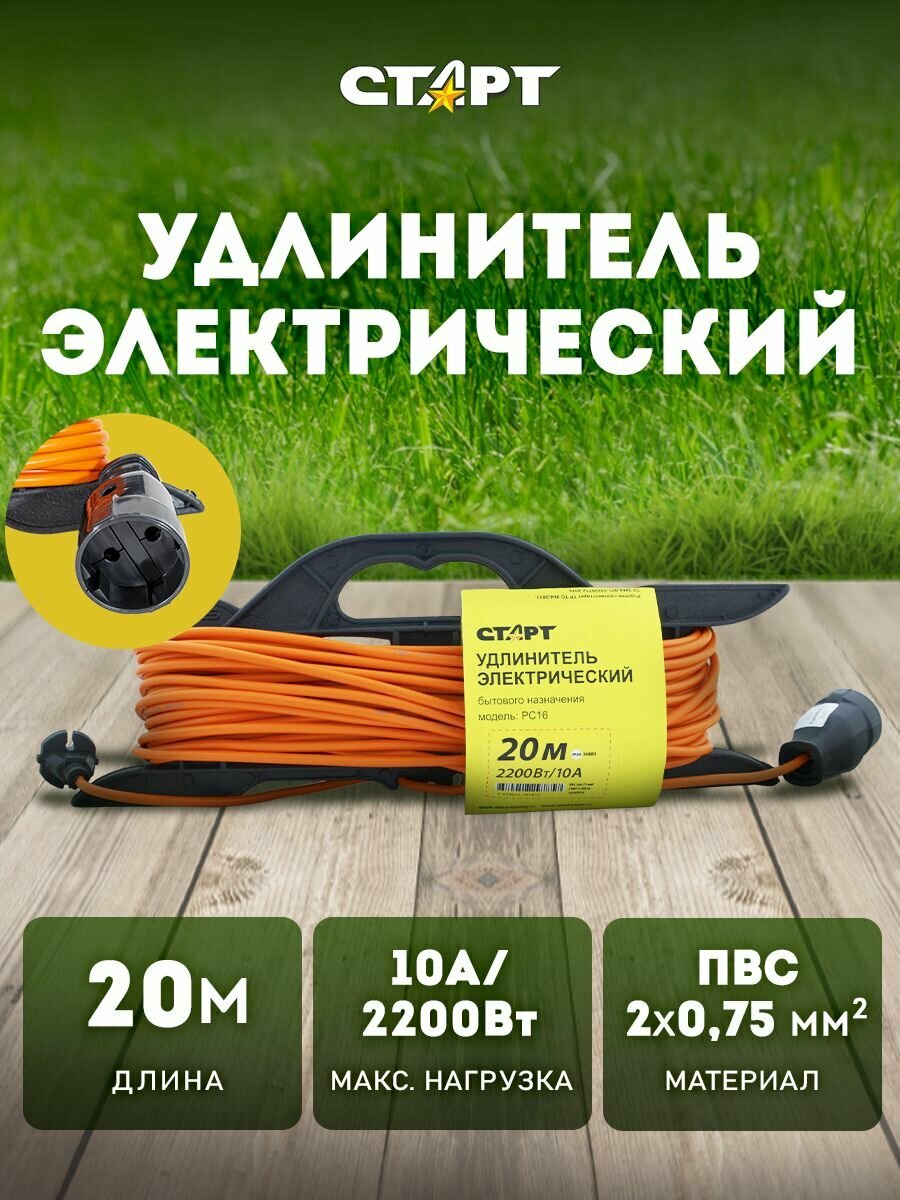Удлинитель на рамке СТАРТ С/УД SG 1х20 с проводом 20м, предназначен для подключения в сеть всех видов бытовой техники cуммарной мощностью до 1,3 кВт.