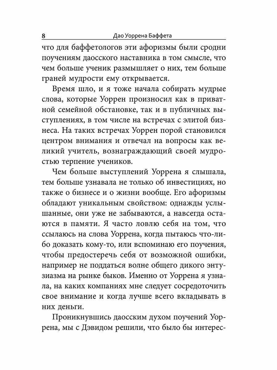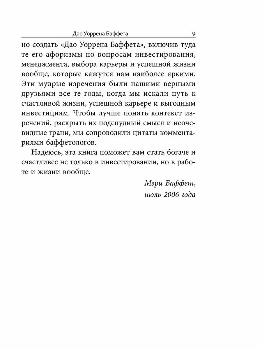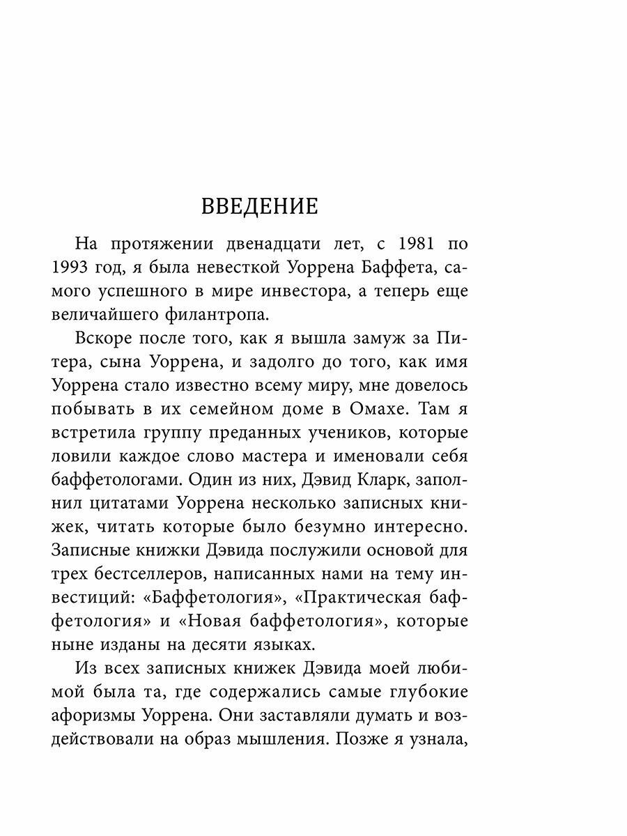 Подобно наставлениям древнекитайского философа Лао-цзы, идеи Уоррена Баффета при всей своей кажущейся простоте невероятно эффективны на практике. Авторы трех бестселлеров, посвященных инвестиционным стратегиям великого мастера, познакомят вас с самыми мудрыми, емкими и запоминающимися высказываниями Уоррена Баффета, приоткрыв завесу тайны над жизненной философией, которая принесла ему и акционерам Berkshire Hathaway баснословное состояние.