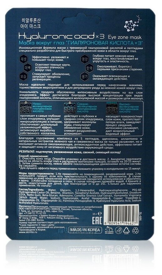 Инновационная формула маски с трехмерной гиалуроновой кислотой и пептидами специально разработана для быстрого преображения кожи в области вокруг глаз - Эффективно увлажняет и повышает тонус кожи. - Осветляет темные круги, устраняет отечность вокруг глаз. - Стимулирует обновление, запускает процессы регенерации. - Глубоко питает нежную кожу вокруг глаз, восстанавливает ее упругость и эластичность. - Омолаживает, борется с первыми признаками старения. - Оказывает освежающее и охлаждающее действие. Низко-молекулярная гиалуроновая кислота проникает в самые глубокие слои эпидермиса, улучшает микроциркуляцию и питание, обеспечивает длительный увлажняющий эффект, активизирует выработку собственного коллагена. Средне-молекулярная гиалуроновая кислота действует в глубоких и средних слоях эпидермиса, удерживает молекулы воды, стимулирует обновление кожи, снимает раздражение, успокаивает. Высоко-молекулярная гиалуроновая кислота насыщает поверхностные слои кожи, препятствует потере влаги, замедляет процесс увядания, интенсивно увлажняет, дает моментальный видимый эффект. Маска идеально подходит для использования перед нанесением макияжа, торжественным мероприятием и для регулярного ухода за нежной кожей вокруг глаз. Уникальность продукта обусловлена интенсивным воздействием на все слои эпидермиса. Эффект достигается благодаря высокой концентрации трех видов гиалуроновой кислоты, отличающихся молекулярной массой и размером цепи молекул. Благодаря содержанию комплекса из 5 пептидов, аденозина, аллантоина и натуральных экстрактов зеленого чая и гамамелиса маска не только увлажняет, но и оказывает активное омолаживающее, антиоксидантное действие, эффективно питает и защищает кожу от негативного воздействия окружающей среды. Результат: подтянутая, увлажненная кожа, свежий, сияющий взгляд!Способ применения: 1. Очистите кожу лица. Откройте упаковку и достаньте маску. 2. Аккуратно приложите маску на область вокруг глаз и расправьте кончиками пальцев, оставьте на 20-25 минут. 3. Затем снимите маску, нежно вбейте похлопывающими движениями остатки состава. Не смывайте. *Для лучшего эффекта перед применением положите упаковку в холодильник на 15 минут.