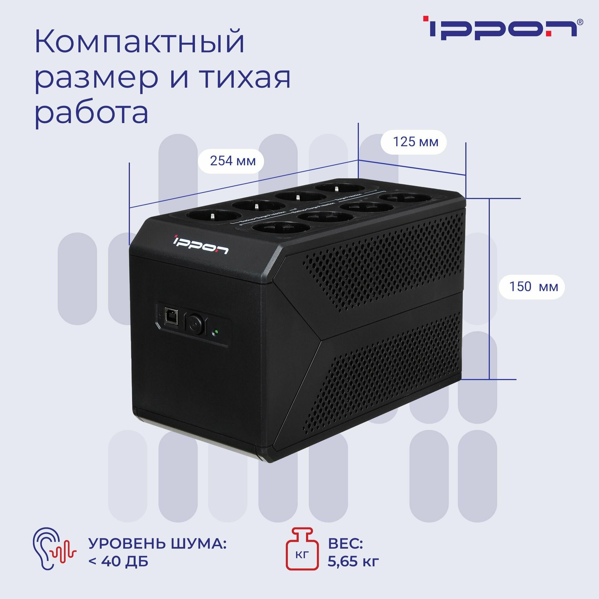 ИБП Ippon линейно-интерактивного типа является универсальным источником питания для использования в домашних условиях или в офисе. Он способен защитить технику от неполадок с питанием в электрической сети, таких как: перепады напряжения, электромагнитные и радиочастотные помехи, высоковольтные выбросы. Данная модель характеризуется полной выходной мощностью 1050 ВА и максимальным показателем входного напряжения 290 В. В оснащение ИБП Ippon входят 8 розеток стандарта евро и интерфейсный порт USB Type B.