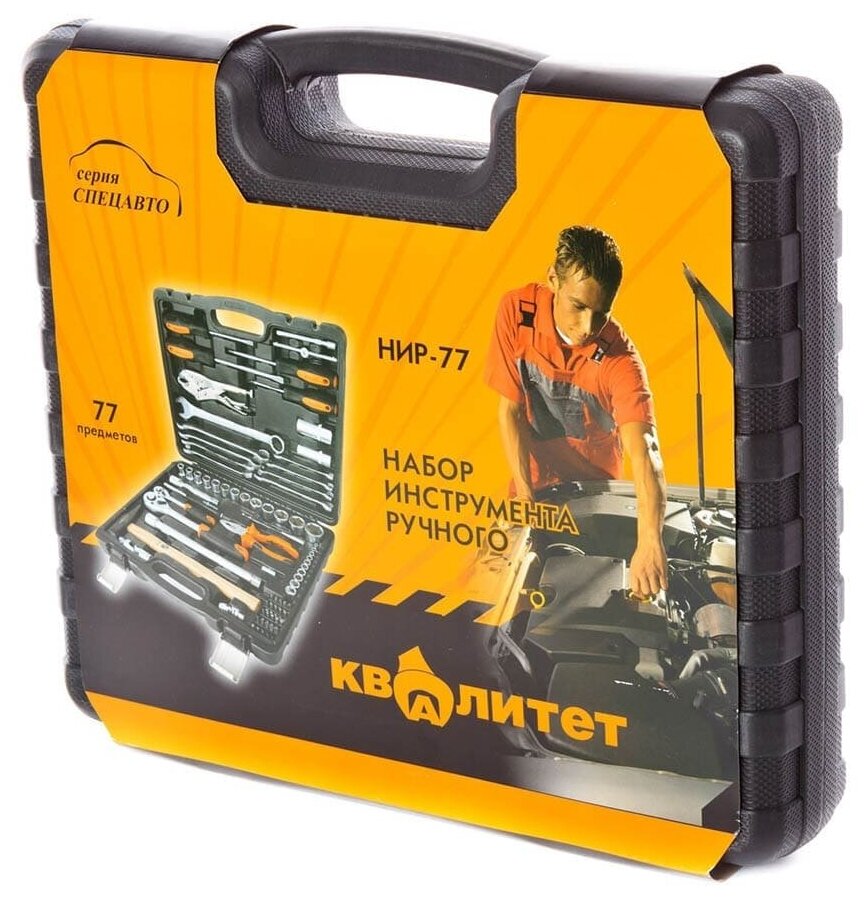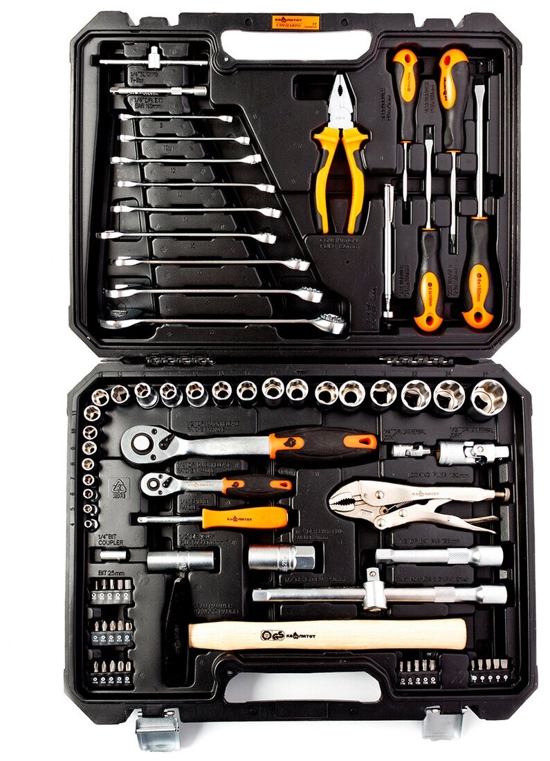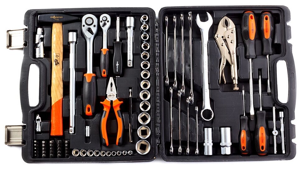 | Комплектация | вороток для головок; зубила; ключ трубный рычажный; ключи гаечные; молоток; отвёртки; пассатижи; рукоять для бит; трещотка; биты; торцевые головки; биты; торцевые головки; удлинитель для головок; шарнир карданный для головок; удлинитель для головок; шарнир карданный для головок |