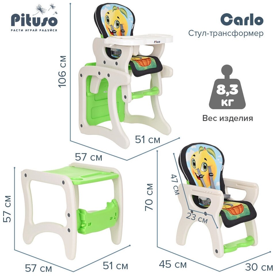 Pituso Стул-трансформер Carlo Жирафик представляет собой идеальную конструкцию 2 в 1. Изначально его можно использовать для кормления малыша, с регулируемой спинкой в 3-х положениях и столиком, регулируемым по глубине посадки, который имеет съемный подносик. А затем, когда малыш подрастет, и в качестве стула с партой.
