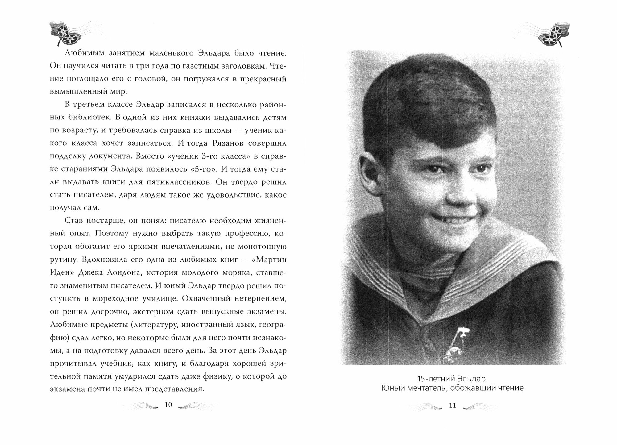 Есть размышления автора, много фрагментов текста из книг Эльдара Александровича, иллюстраций тоже много это:кадры из фильмов,съёмочный процесс,афиши его фильмов. В книге затрагиваются не только его известные картины такие, как: «Ирония судьбы...», «Служебный роман», «Жестокий романс», «Гараж»,и.д.р.,но и малоизвестные,например: «Человек ниоткуда», документальный фильм «Остров Сахалин» , и первый художественный фильм (он был до «Карнавальной ночи»).