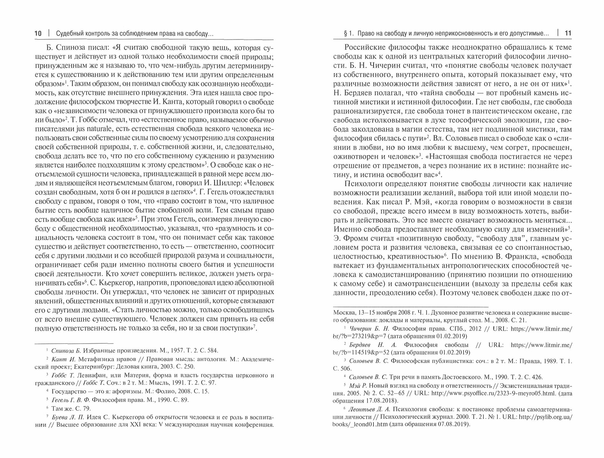 Монография раскрывает особенности и перспективы судебного контроля как особой формы защиты права на свободу и личную неприкосновенность. В работе проанализированы пределы допустимых ограничений права на свободу и личную неприкосновенность на основе позиций Европейского Суда по правам человека и практики российских судов, а также процессуальные особенности судебного контроля.