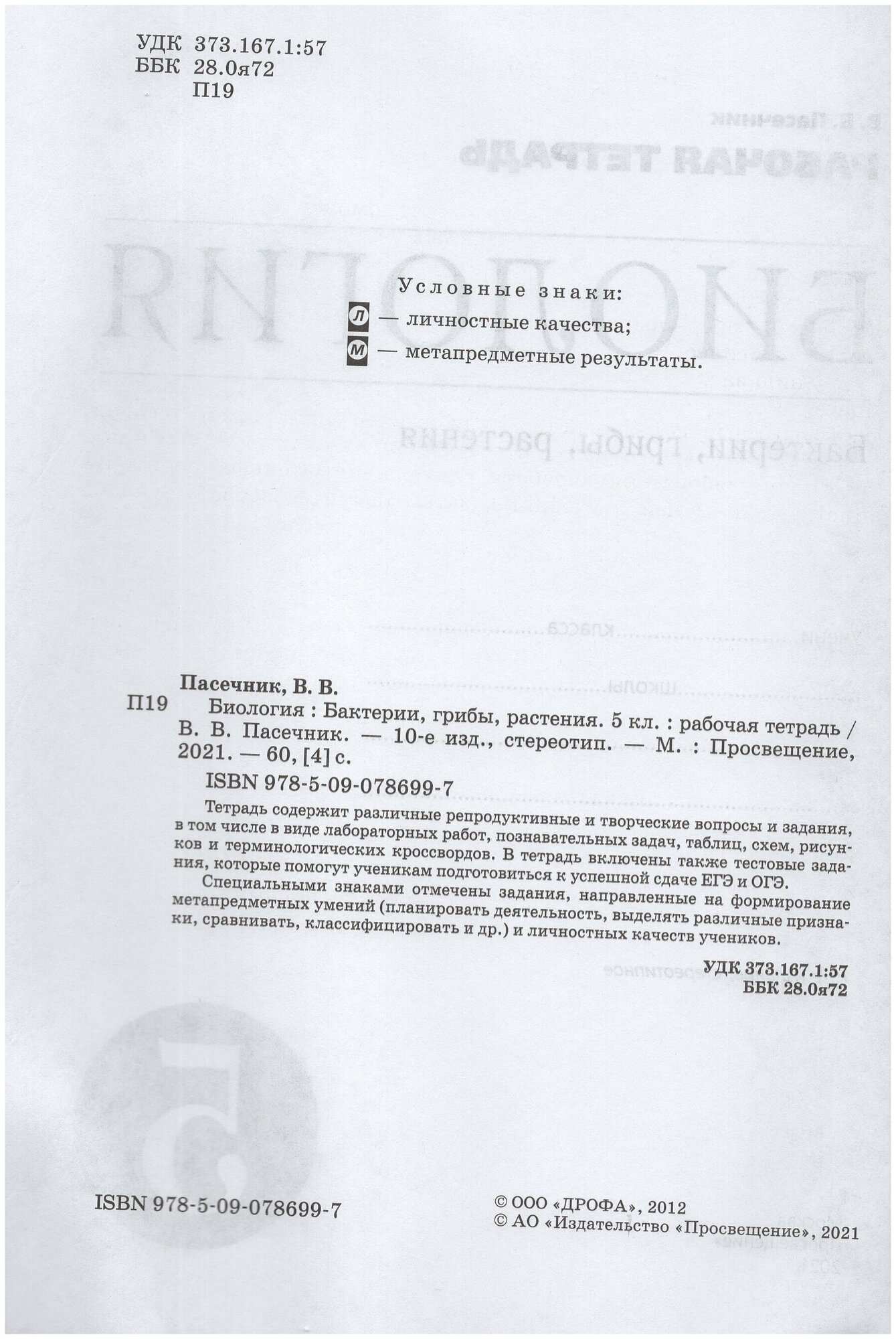 Биология 5 класс Бактерии грибы растения Рабочая тетрадь к учебнику В В Пасечника (Пасечник Владимир Васильевич); Просвещение, 2021