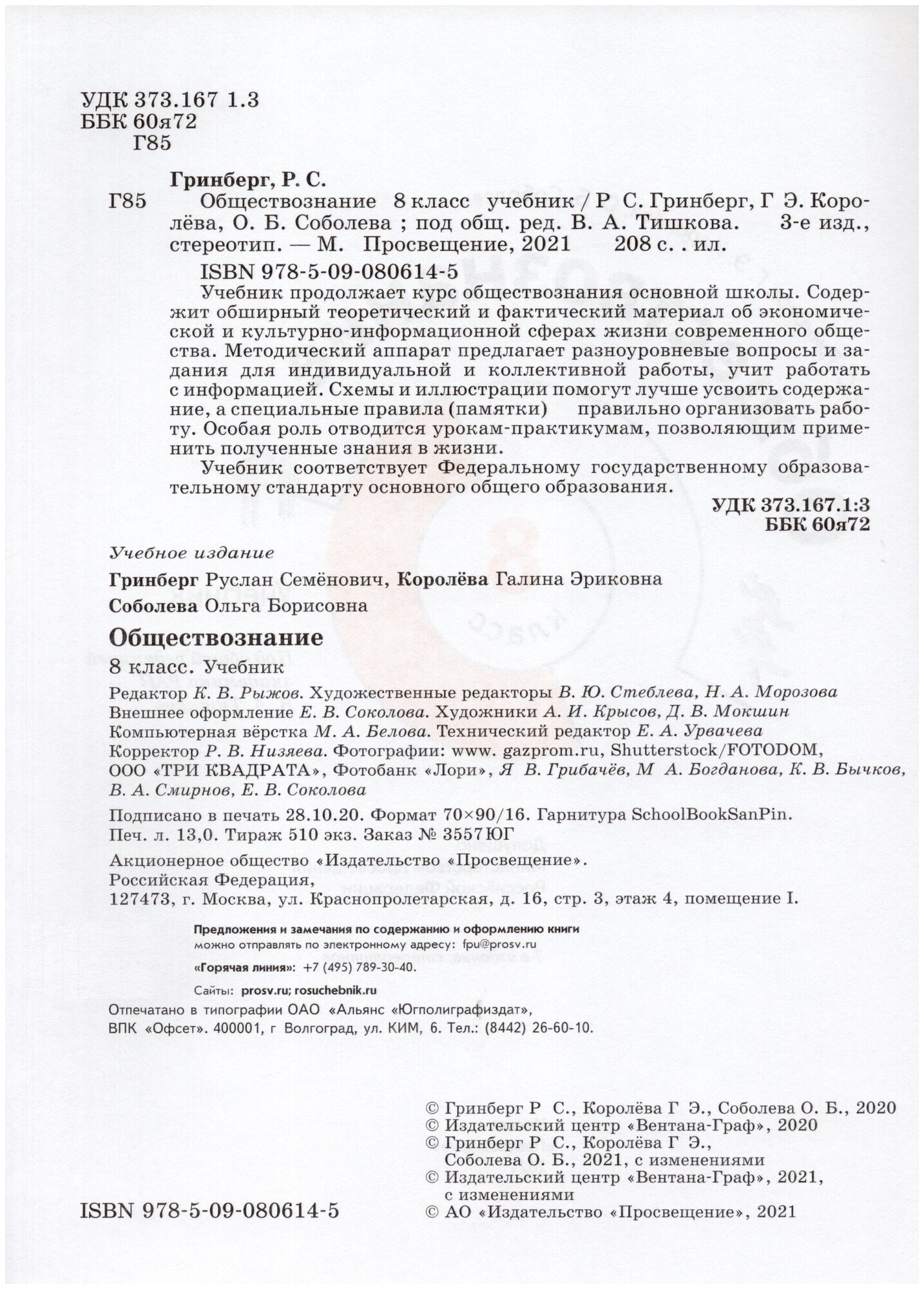 Обществознание 8 класс Учебник (Гринберг Руслан Семенович; Соболева Ольга Борисовна; Королева Галина Эриковна); ВЕНТАНА-ГРАФ, 2021