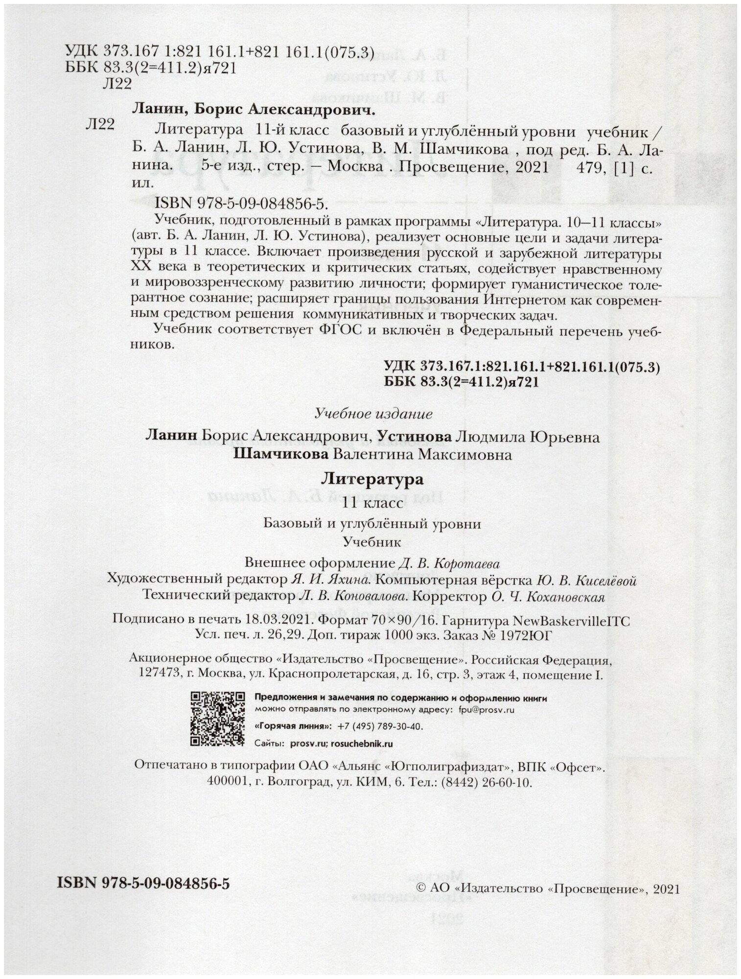 Литература 11 класс Учебник Базовый и углубленный уровни (Борис Александрович Ланин); Вентана-Граф, 2021