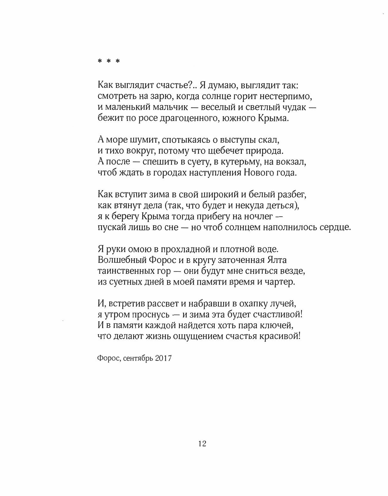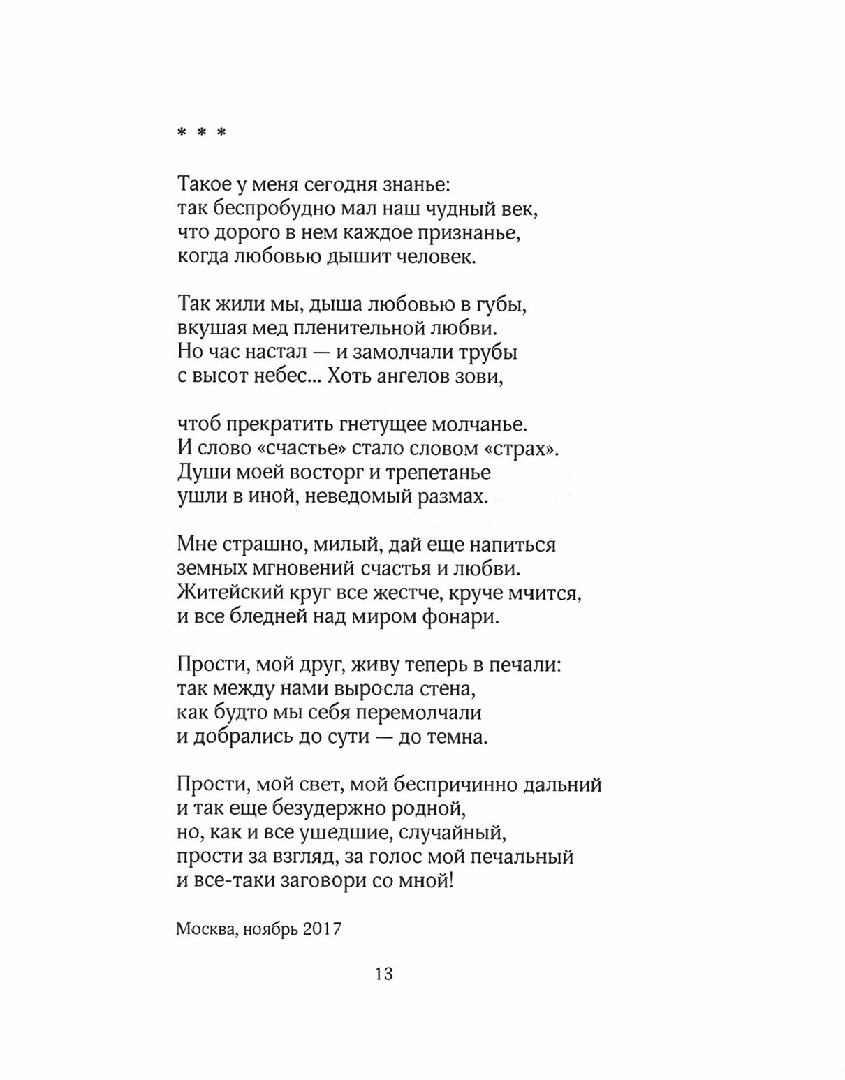 Легкость и динамичность переплетены со своеобразной лексикой и оригинальными рифмами. Одиночество и одновременно включенность во вселенский процесс, значимость человеческого бытия и ощущение сосуществования с другими, любовь и страдание прослеживаются через строки и вовлекают в себя. Это опыт вживания и вчувствования в чужой жизненный опыт. Стихи не оставят читателя безразличным и подарят ему множество новых эмоций и переживаний.