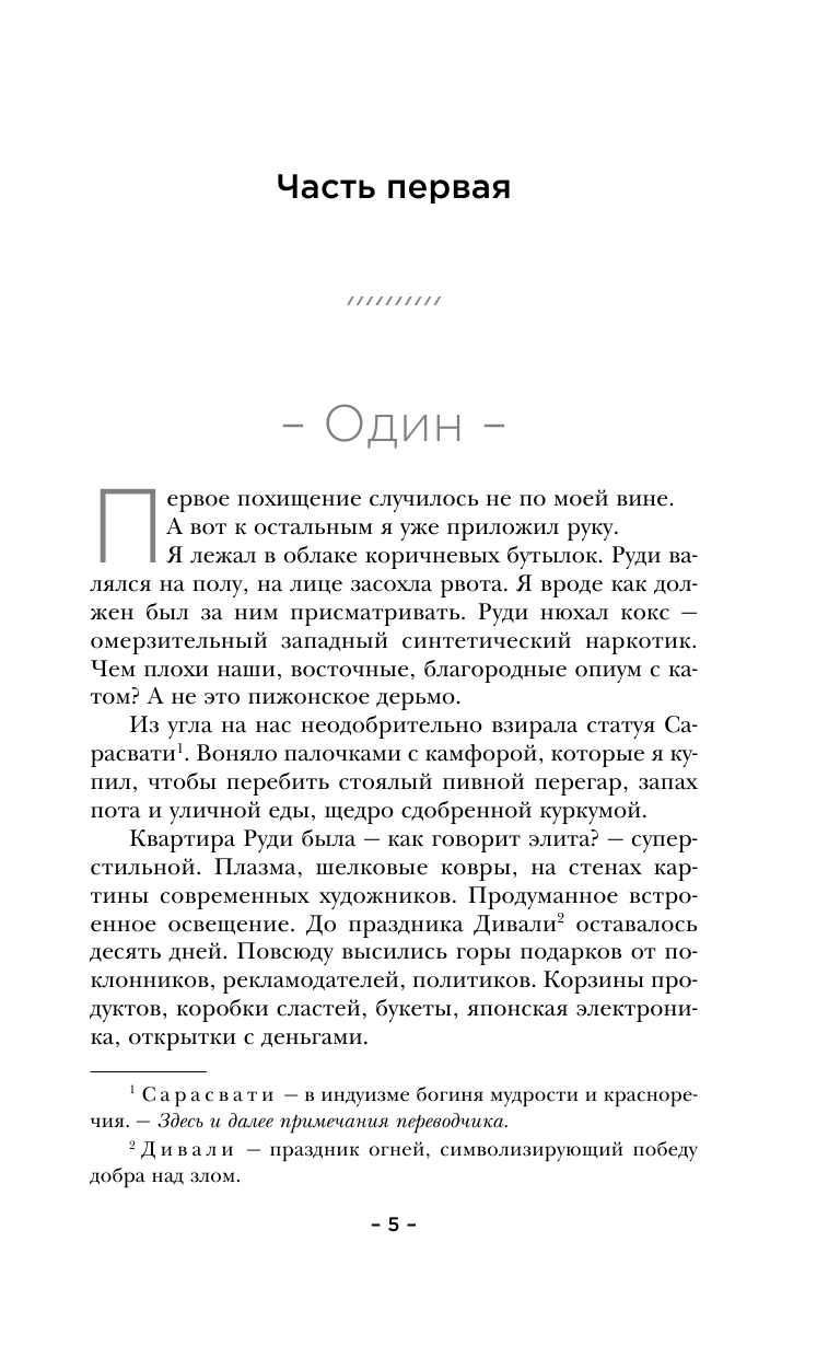 Непривычная индийская история (непривычная тем, что индийских книг я как-то не так чтобы много читала). Действительно есть что-то от фильмов Гая Ричи (по крайней мере, мне хочется так думать). Местами забавная, местами циничная, местами лихая и авантюрная. Мне понравилось то, что она не оставляет тебя после прочтения в каком-то состоянии нелепого транса, а наоборот как-то встряхивает и дает энергию.