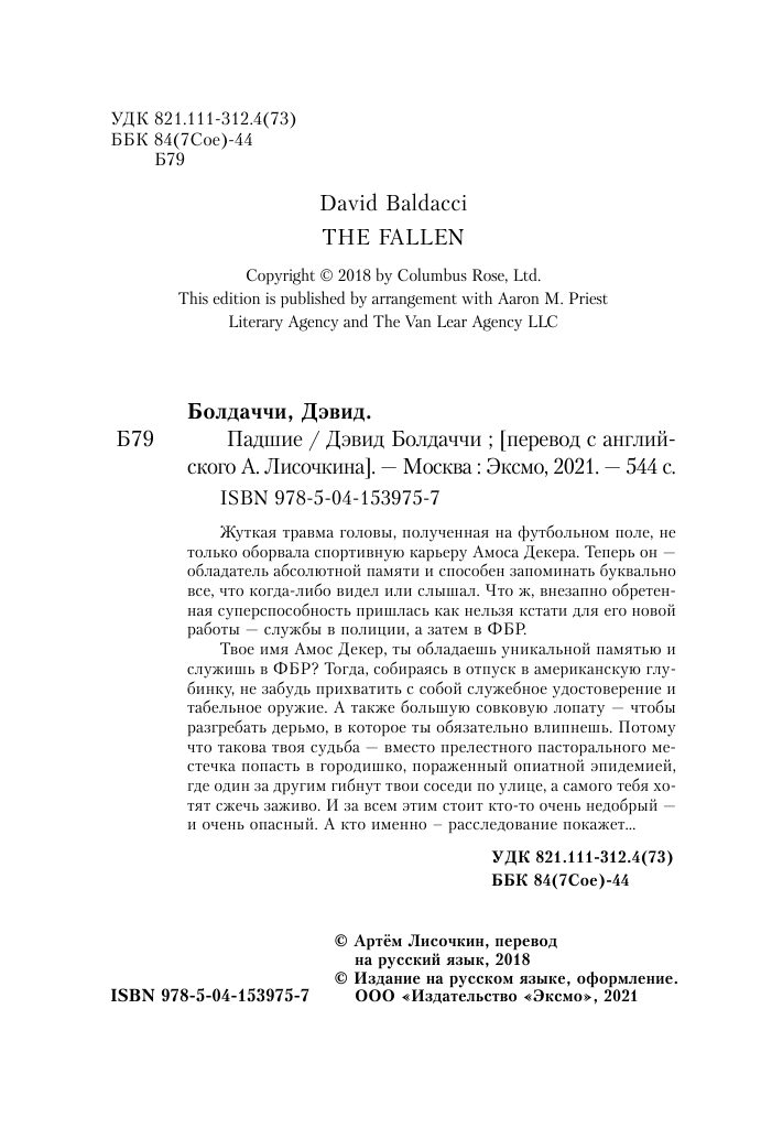 Неожиданно приятное продолжение серии. Признаться честно, после третьей книги я откровенно разочаровалась. Если не в Болдаччи, как в писателе, то в самой серии про Амоса Декера так точно. К счастью, четвертая часть немного улучшила общее впечатление. В бурном восторге, как от первой книги, не нахожусь, но «Падшие» - вполне себе приятный середняк, где-то на уровне «Последней мили».