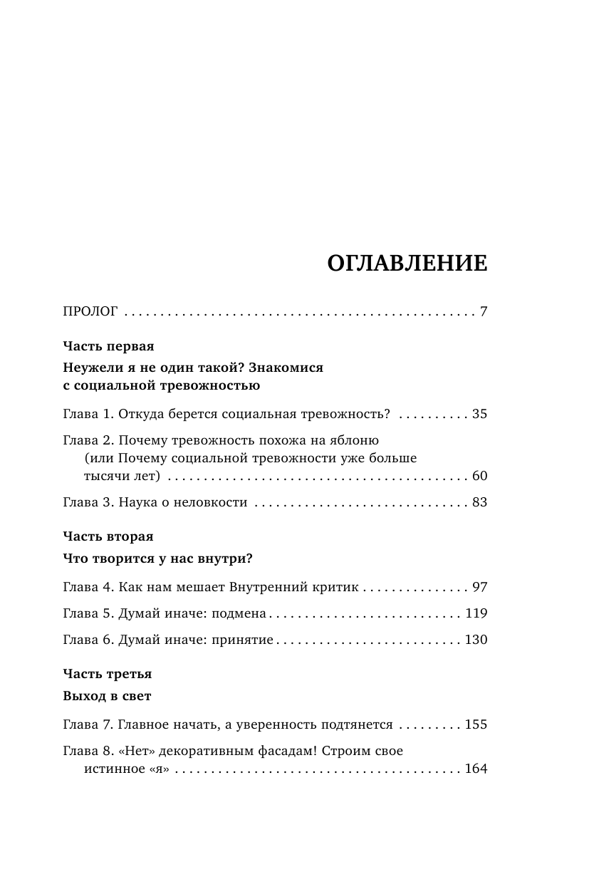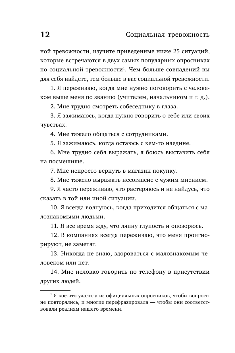 Прекрасная книга о социальной тревожности. Решила купить, так как в последнее время интересуюсь этой темой и часто нахожу проявления такой тревожности у себя. Наверное, очень многие в наши дни тоже могут отнести себя к так называемым «тихоням», которые не любят вступать в разговор и неловко молчат, оказавшись со знакомым наедине. Иногда мы даже упускаем возможность заявить о себе, просто потому что боимся совершить ошибку и показаться надоедливыми, глупыми, недостаточно компетентными. Даже если вы никогда не задумывались о присутствии у себя социальной тревожности — попробуйте почитать, в начале книги как раз есть тест на определение у себя признаков. Наверное, интроверты подпишутся под каждым словом и найдут множество полезных советов для себя. В общем, рекомендую!