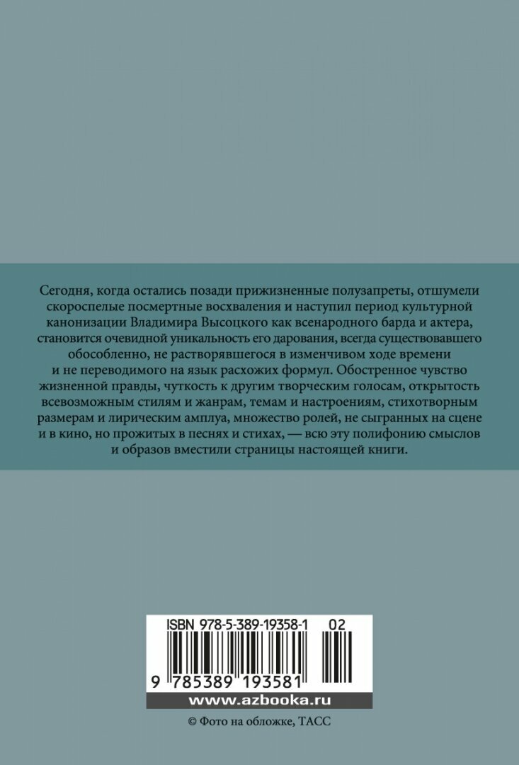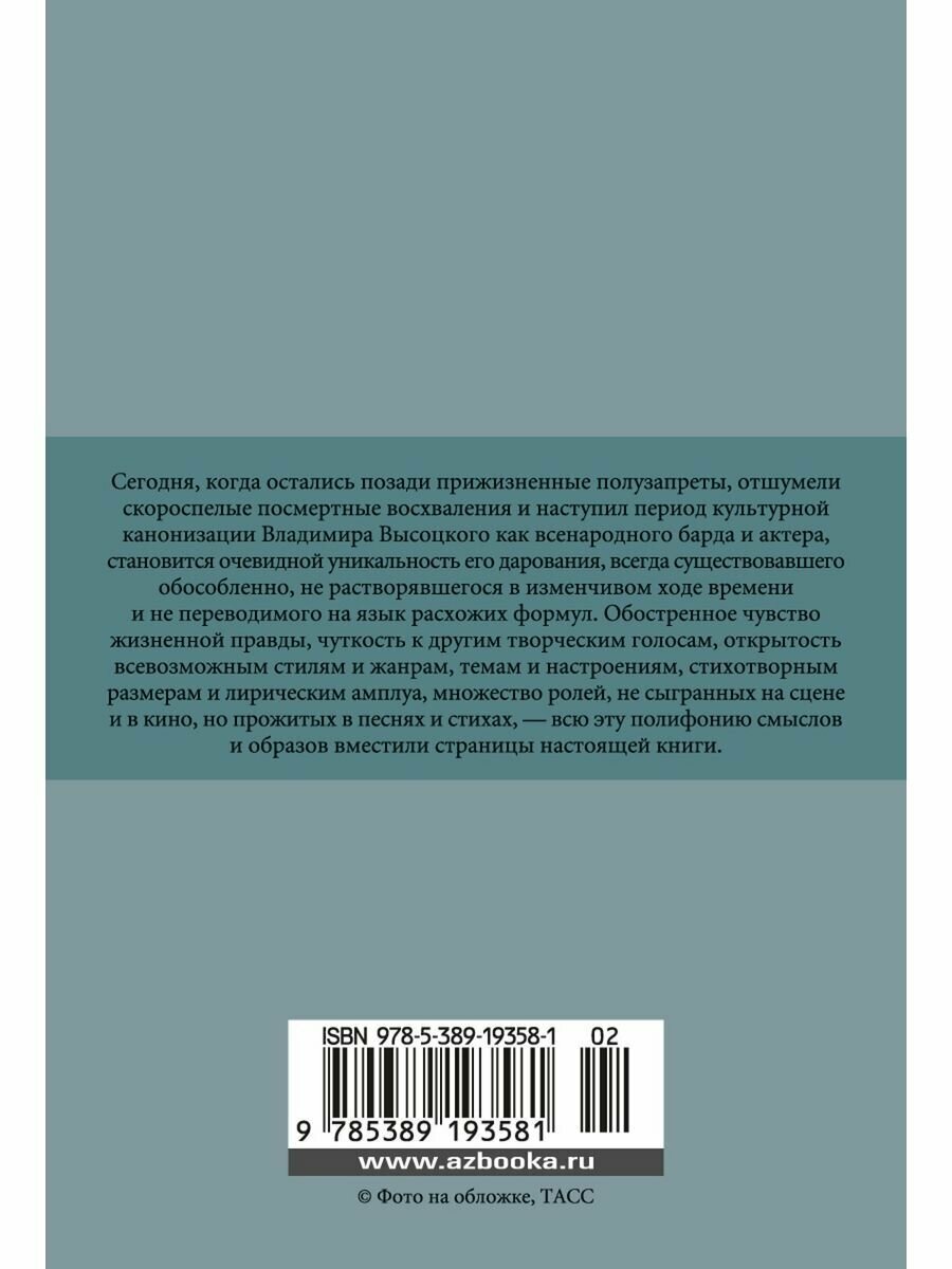 Сегодня, когда остались позади прижизненные полузапреты, отшумели скороспелые посмертные восхваления и наступил период культурной канонизации Владимира Высоцкого как всенародного барда и столь же всенародно любимого актера, становится очевидной уникальность его дарования, всегда существовавшего обособленно, не растворявшегося в изменчивом ходе времени и не переводимого на язык расхожих формул. Как ни парадоксально, эта верность себе сочеталась в личности Высоцкого с необыкновенной восприимчивостью к другим творческим голосам, к образному строю высокой поэзии и прозаизмам обыденной речи, с открытостью всевозможным стилям и жанрам, темам и настроениям, стихотворным размерам и лирическим амплуа. Обостренное – до оголения нервов – чувство жизненной и поэтической правды, абсолютный слух, отвергающий любую фальшивую интонацию, неимоверное разнообразие ролей, не сыгранных на сцене и в кино, но прожитых в песнях и стихах, – всю эту полифонию смыслов и образов вместили страницы настоящей книги.