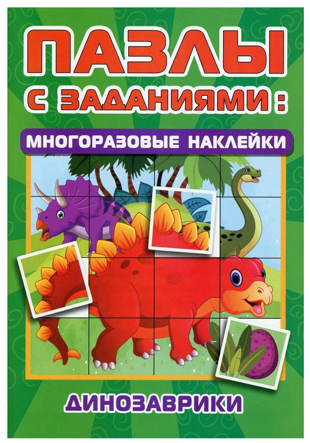Пазлы с многоразовыми наклейками \"Динозаврики\" подходит для детей младшего дошкольного возраста. Плотная глянцевая обложка с с яркими разноцветными динозаврами привлекает малышей. Бумага плотная, цветные страницы с разнообразными динозавриками, внизу забавные стишки - загадки. Задание заключается в том, чтобы найти подходящую наклейку и заполнить пробелы на картинке.