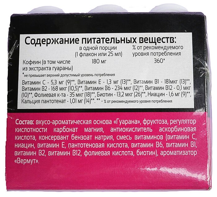 | Состав | Состав: Вода подготовленная, вкусо-ароматическая основа "Гуарана" (вода, регулятор кислотности лимонная кислота, натуральный ароматизатор, краситель сахарный колер IV, кофеин, экстракт гуараны, антиокислитель аскорбиновая кислота, консервант бензоат натрия, инвертный сироп), фруктоза кристаллическая, магний углекислый легкий, ароматизатор, премикс витаминный (Витамин С, ниацин, Витамин Е, пантотеновая кислота, Витамин В6, Витамин В1, Витамин В2, фолиевая кислота, биотин, Витамин В12), Витамин С, консервант бензоат натрия. |