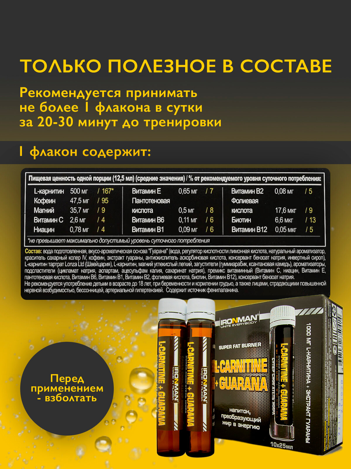 Жиросжигатель "Суперсжигатель" от Ironman - это эффективный способ борьбы с лишними килограммами. Продукт представлен в форме ампул объемом 25 мл каждая, всего в упаковке 10 ампул. Это обеспечивает удобство использования и точность дозировки.