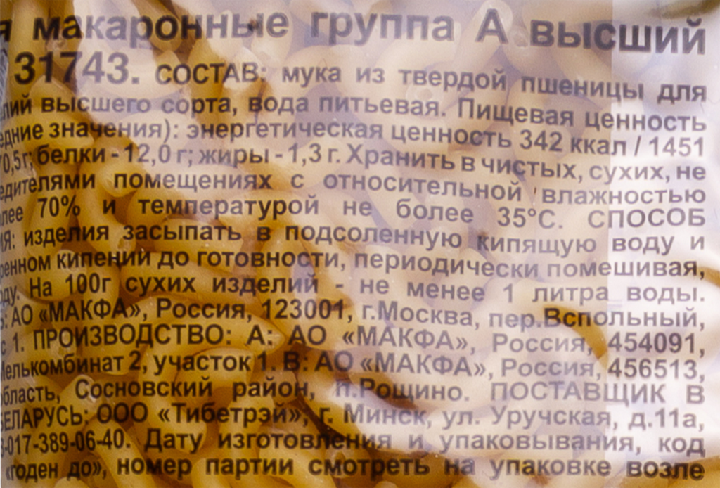 | Состав | мука из твердой пшеницы для макаронных изделий высшего сорта, вода питьевая |