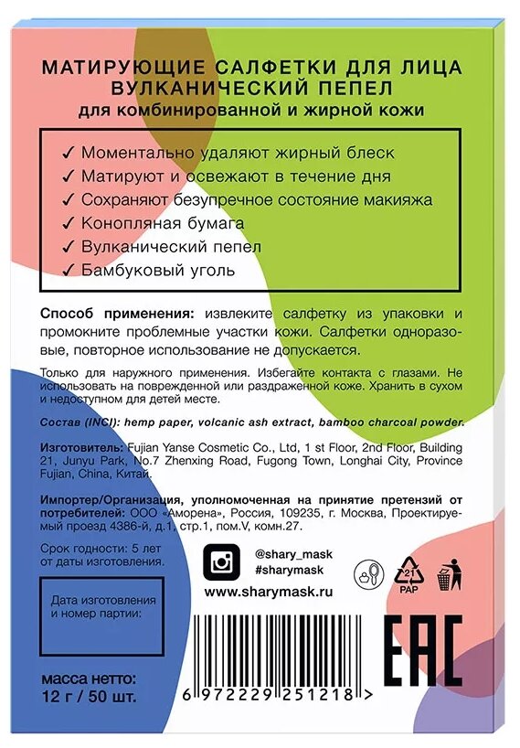 | Полное наименование | Shary, Матирующие салфетки для лица «Вулканический пепел», 12 г |