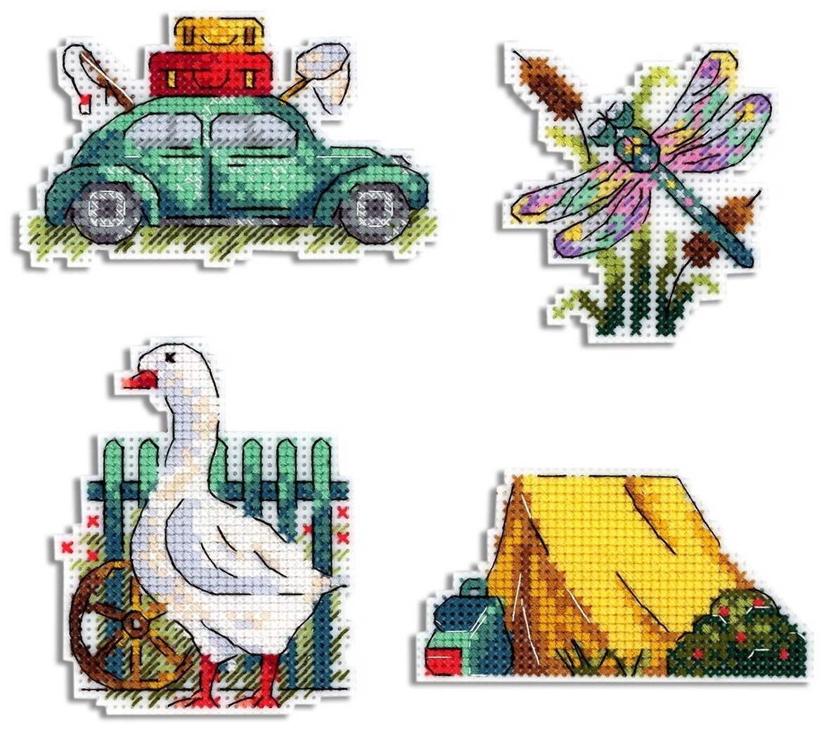 | Комплектация | пластиковая канва для 4-х сюжетов 7x8 см; хлопковое мулине; фетр белого цвета; игла; магнитное полотно; схема; инструкция |
