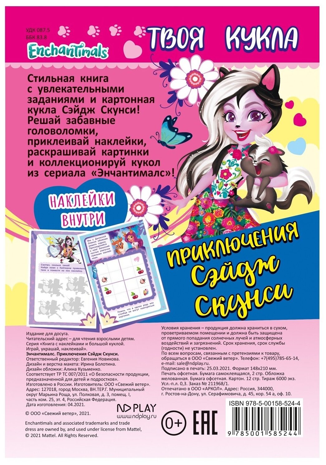 Стильная раскраска с картонной куклой-героем мультфильма "Энчантималс" (Enchantimals), разворотом ярких наклеек, увлекательными заданиями, красочными иллюстрациями, головоломками и лабиринтами - лучший подарок для любого ребенка!