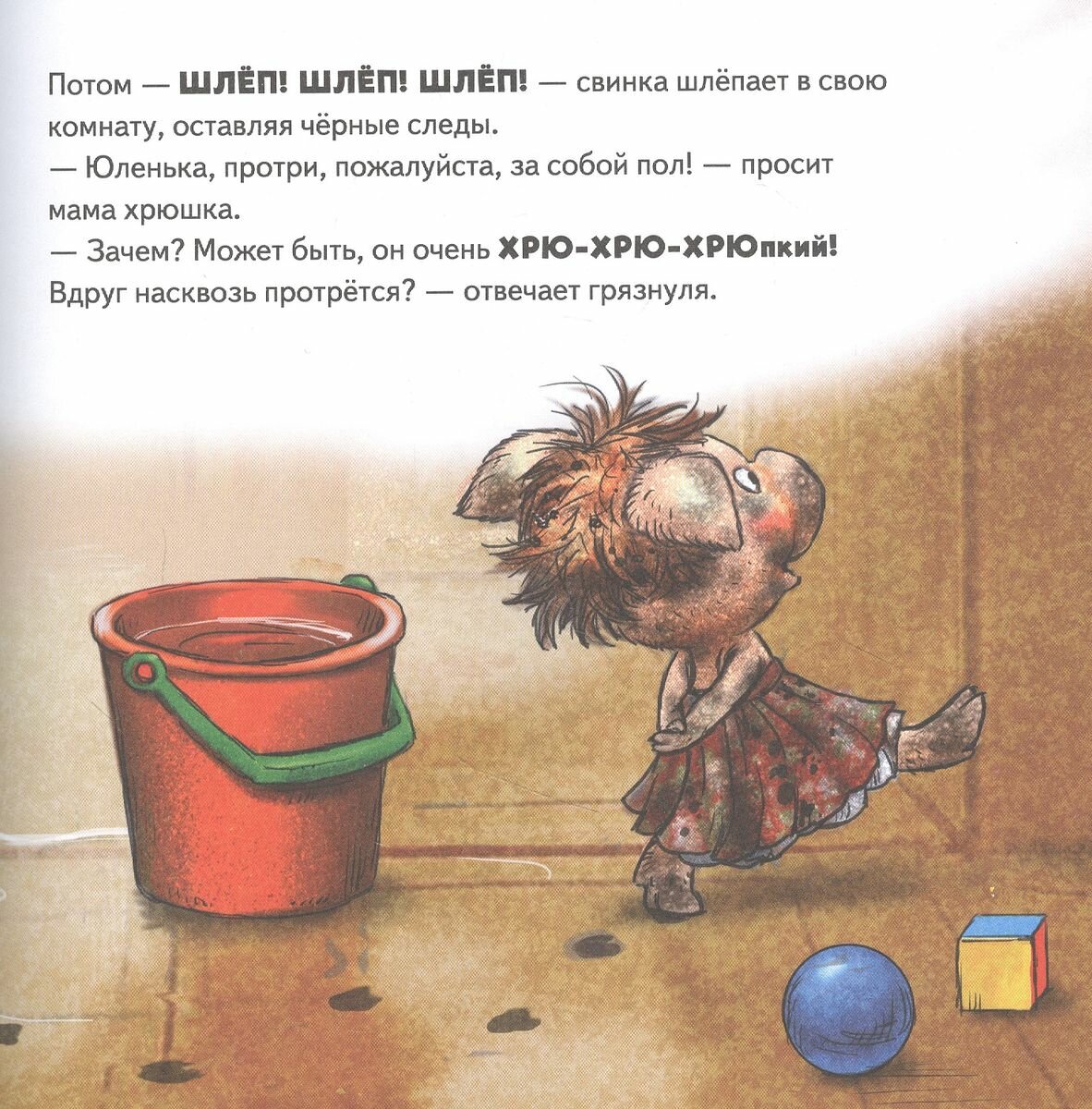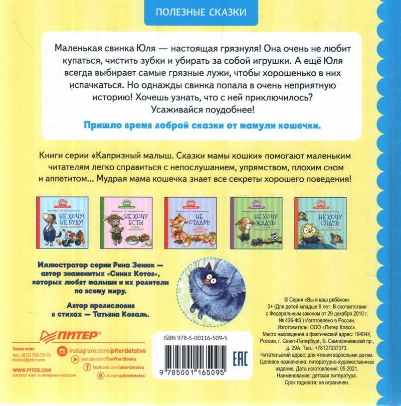 Истории мамы Кошки, которые она рассказывает своим котятам) В данной книге история про поросюшку грязнулю! Ну вот совсем не любит свинка Юля мыться, упрямится и любит поваляться в лужах и грязи. И , в итоге, она попадет в такую ситуацию, когда валяния в грязи приведут к последствиям из которых сложно выпутаться! Сказка конечно закончится хорошо, и малютка свинка отмоется) Чудесное оформление всей серии , квадратный формат, уютные и теплые иллюстрации, которые так понравились деткам) Читаются сказки легко, и всегда есть что обсудить после прочтения.