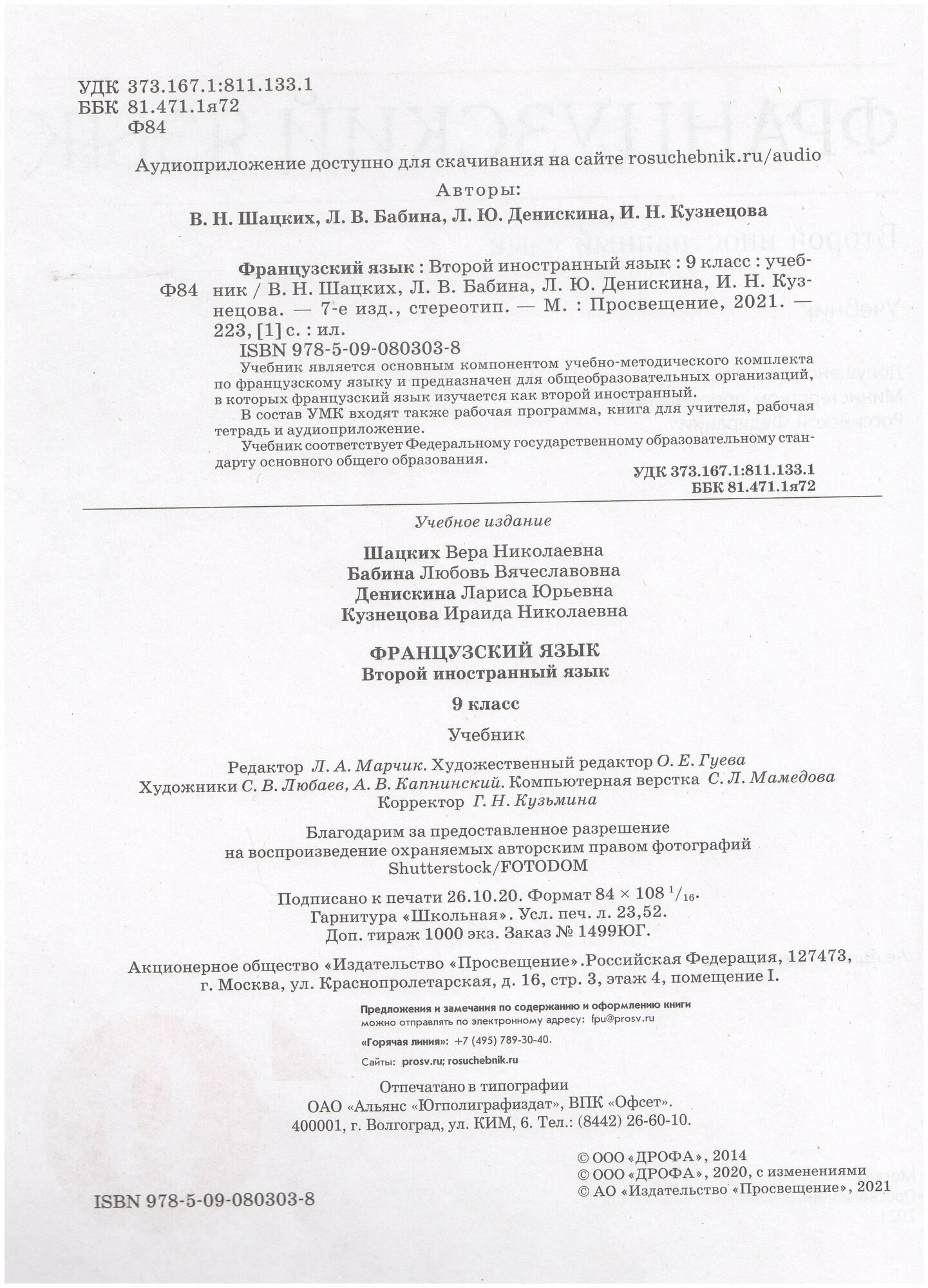 Французский язык Второй иностранный язык 9 класс Учебник (Шацких Вера Николаевна, Бабина Любовь Вячеславовна, Кузнецова Ираида Николаевна, Денискина Лариса Юрьевна); Просвещение, 2022