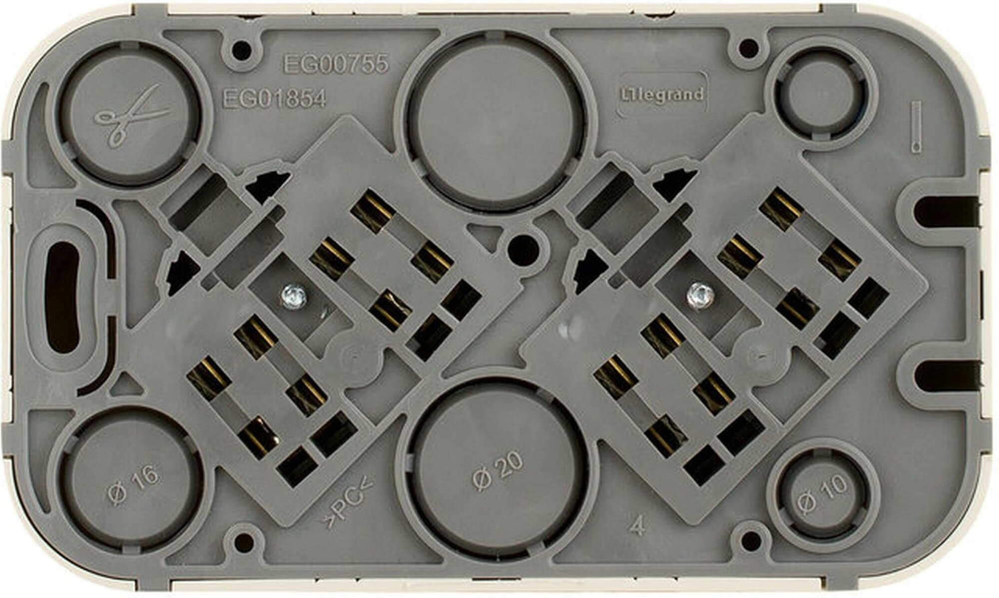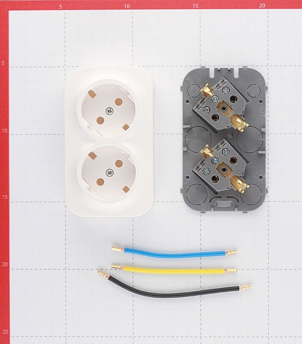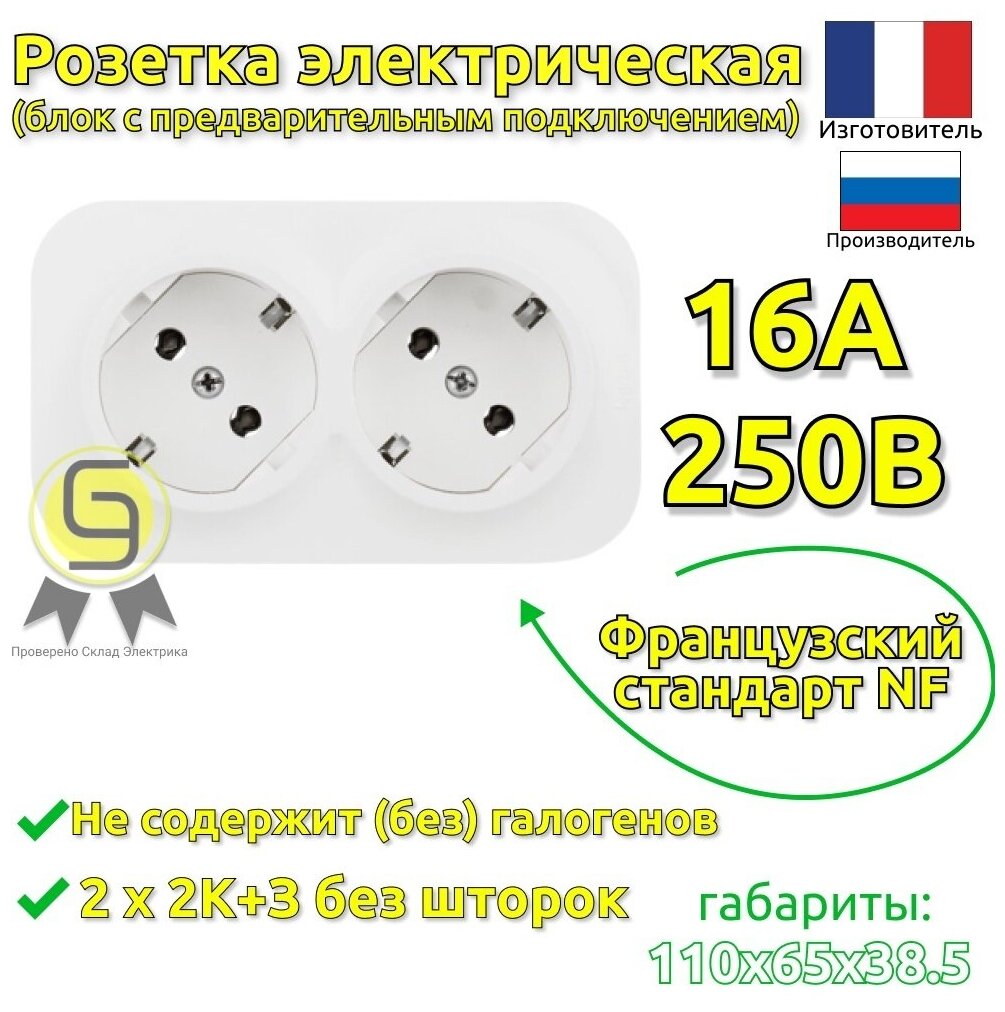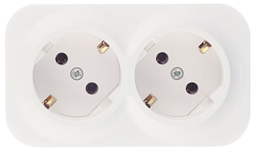 Двухместная розетка 2К+З без шторок, со степенью защиты IP20 может устанавливаться как вертикально, так и горизонтально