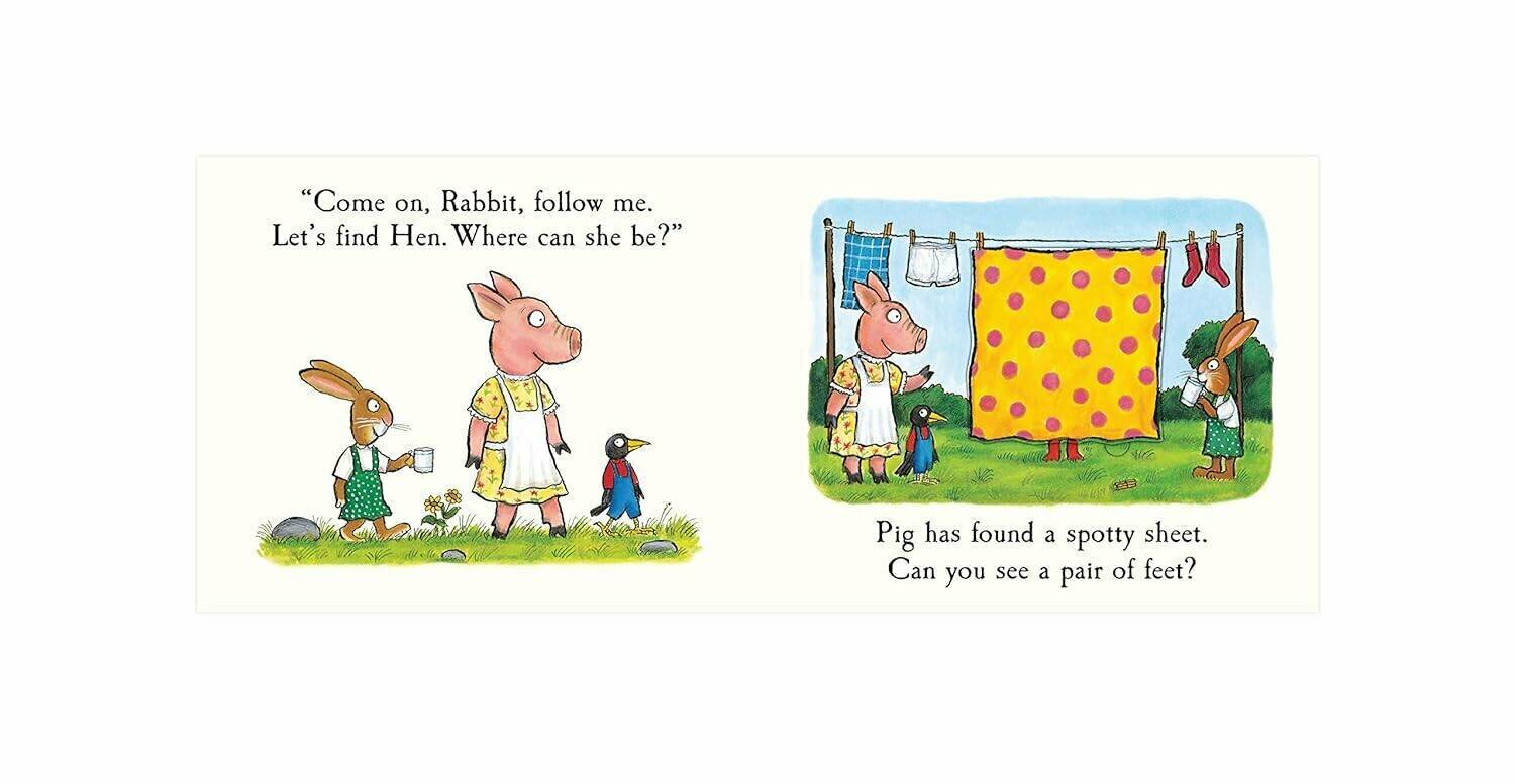 Pig and Hen are playing hide-and-seek. But where on earth could Hen be? Can you lift the flaps and help Pig find out where Hen is hiding?
