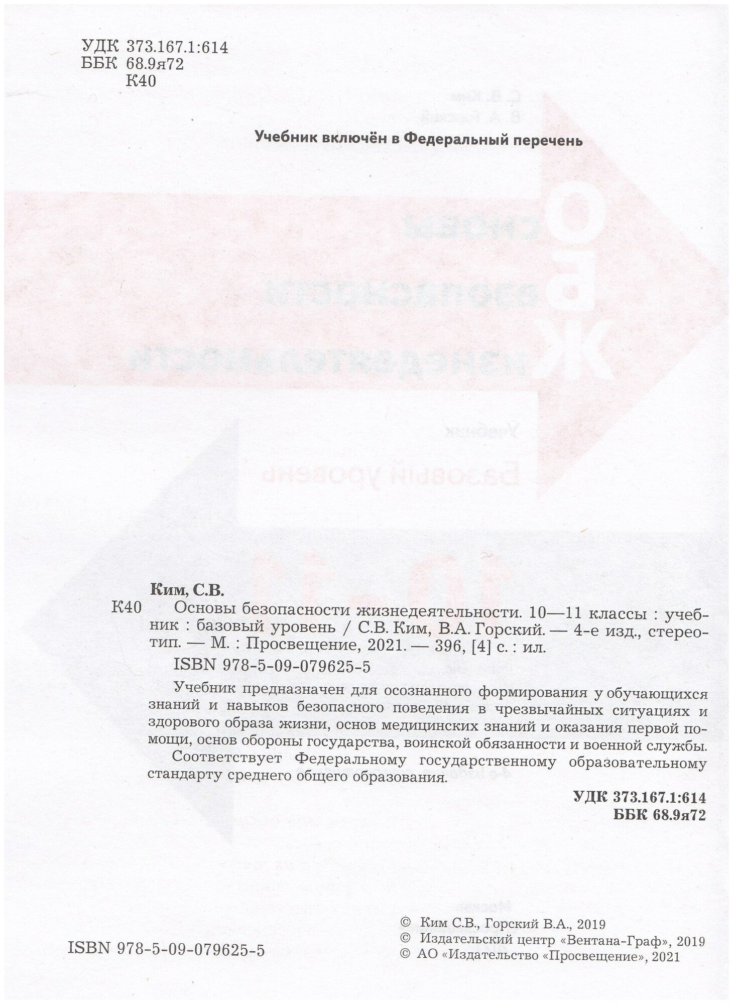 Основы безопасности жизнедеятельности Учебник 10-11 классы (Ким Светлана Викторовна, Горский Владимир Акхамович); Вентана-Граф/Просвещение, 2022