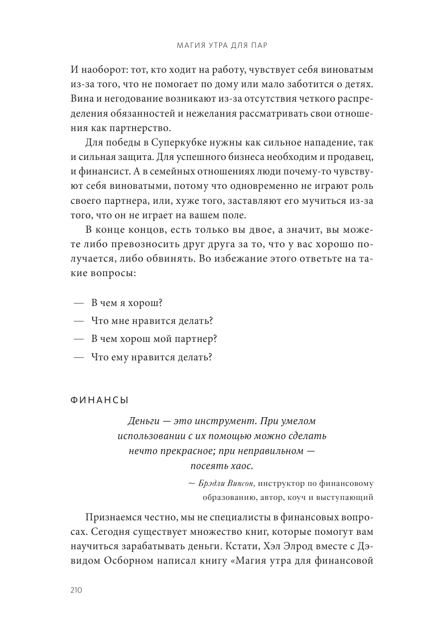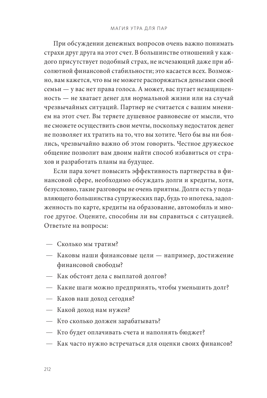 В «Магия утра для пар. Как освежить чувства и вернуть любовь» есть все эти рекомендации из прошлых книг и плюс советы, касающиеся непосредственно отношений в паре. Для начала надо принять на себя ответственность за свою жизнь и организовать окружающую обстановку. В последнее входит: