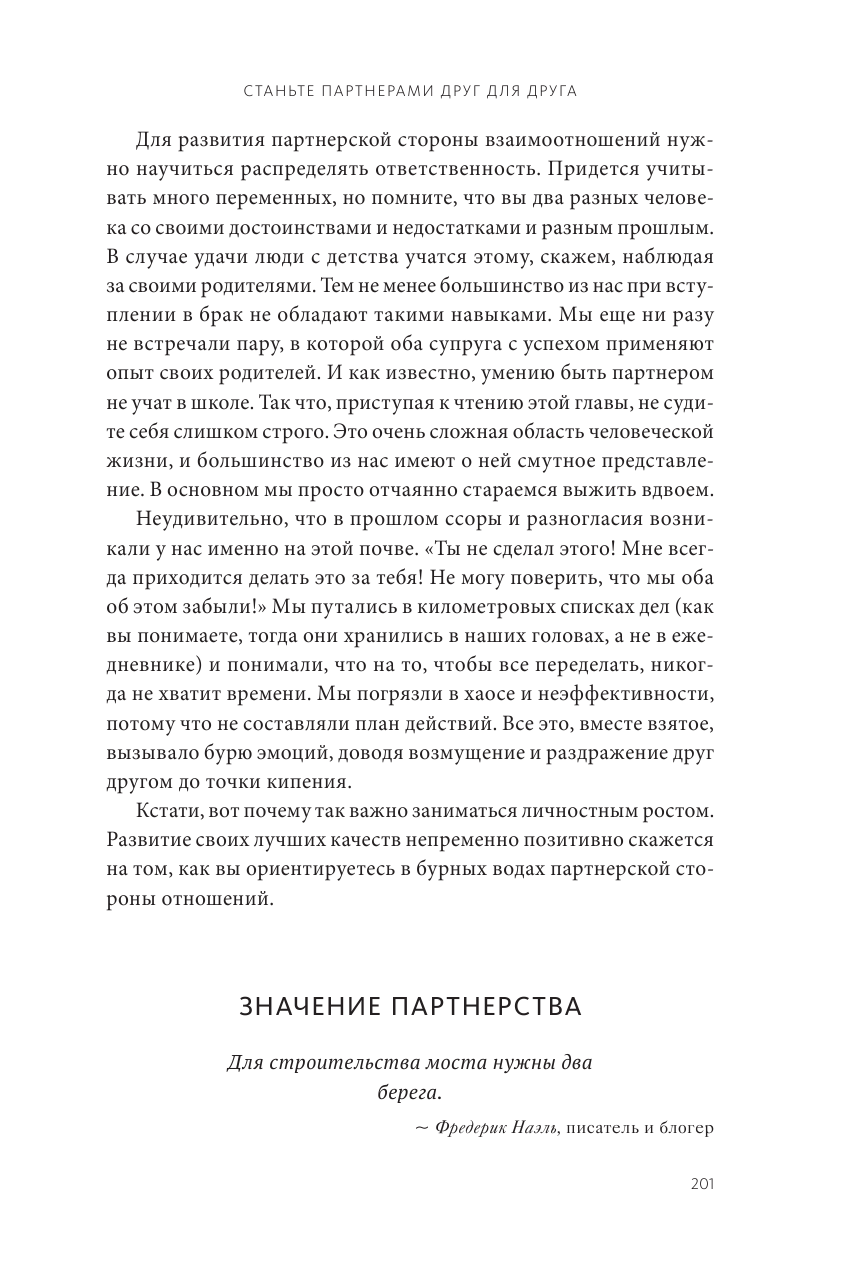 Можно ли назвать их брак идеальным? На этот вопрос Лэнс и Брэнди решительно ответят "нет". На их взгляд, совершенство в браке и не было их целью - не это главное. Суть в том, что за годы упорного труда и твердой решимости сделать свой брак процветающим Лэнс и Брэнди разработали эффективный подход к совместной жизни, который укрепил их союз. Этот подход очень помог и нам с Урсулой достичь такого же результата. А теперь он описан в нашей общей книге и может помочь и вам, независимо от того, на каком этапе развития находятся сейчас ваши отношения.