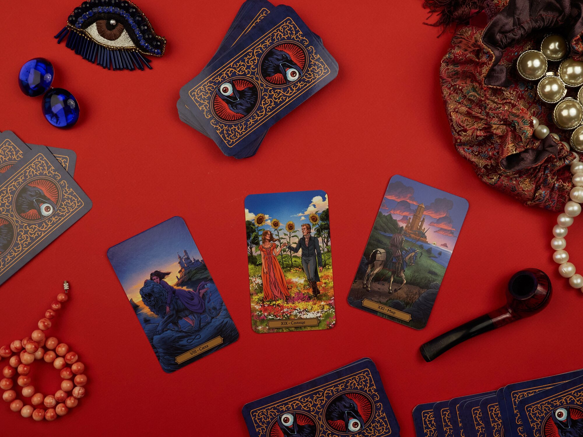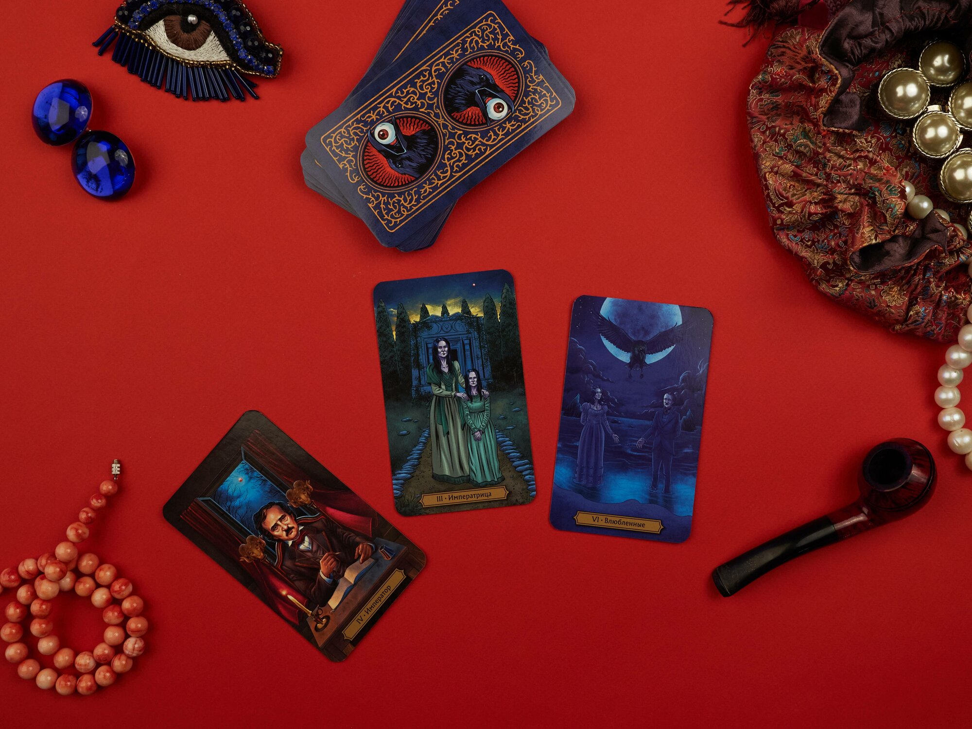 Как же я ждала эти карты! Набор превзошёл мои ожидания - они просто роскошны! Яркие, блестящие, картинки чёткие - глаз не оторвать. Качество самих карт, как у таро Everyday Witch этого же издательства, - такие же глянцевые и примерно такой же плотности, сами листы карт довольно жёсткие. Края обрезаны идеально, колода ровная. Размер карты 7х11,7 см. Набор упакован в плотную коробку с лентой. Книжечка с цветными иллюстрациями раскрывает связь карт с сюжетами произведений Эдгара По. Мне очень понравились карты, благодарности моей нет предела!