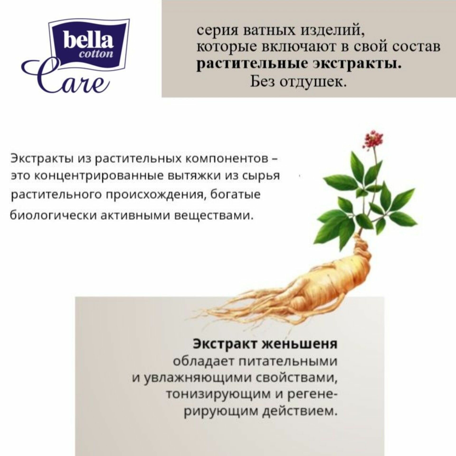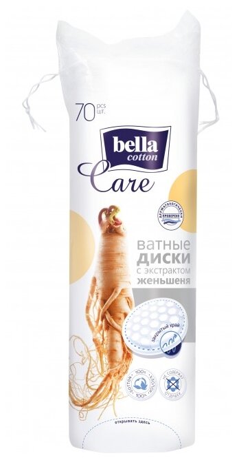Bella cotton care Ватные диски с экстрактом женьшеня 70 шт. Изделия из хлопка bella cotton care изготовлены из 100% хлопка, который отбелен без использования хлора и не содержит оптических отбеливателей. Продукция прошла дерматологические испытания. Двухсторонние, с закрытым краем. Тиснение на хлопковом полотне в виде сот. Благодаря ему косметическое средство быстро и равномерно распределяется по диску, что позволяет эффективно удалять макияж. Экстракт женьшеня обладает питательными и увлажняющими свойствами, тонизирующим и регенерирующим действием. Не имеют запаха и цвета.