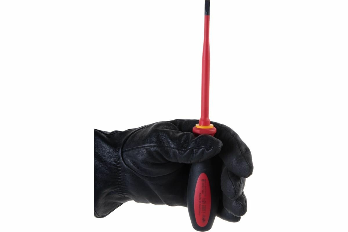 Отвертка прошла тестирование напряжением 10000 Вольт по стандарту VDE и предназначена для работы в электроустановках напряжением до 1000 Вольт. Премиальное качество стали с молибденом и ванадием для большего срока службы. Фрезерованные наконечники для точной посадки и исключения эффекта проскальзывания. Покрытие черным фосфатом наконечника обеспечивает защиту от коррозии. Тонкий стержень для доступа в ограниченном пространстве. 2-х компонентная рукоятка с мягкими накладками обеспечивает комфортную работу. Трехгранный дизайн рукоятки исключает проскальзывание и обеспечивает максимальную передачу момента. Тонкий дизайн передней части для работы с небольшой мощностью и тонких работ по электрике. Лазерная гравировка с типом наконечника на верхней части рукоятки для удобной идентификации. Не катается, благодаря трехгранной рукоятке.