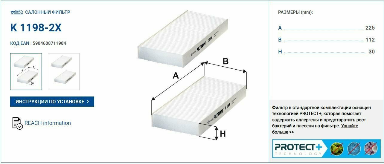 Фильтр салона FILTRON K 1198-2X для Honda Civic/CR-V/FR-V/Stream 01> изготавливается с помощью высококачественных фильтрующих материалов, которые обладают электростатическими свойствами и, таким образом, способны удерживать даже микроскопические частицы вредных примесей (в несколько десятков раз меньше диаметра человеческого волоса).Дополнительная защита благодаря технологии PROTECT+Технология PROTECT+ уменьшает риск аллергических реакций и защищает пассажиров от аллергенов, бактерий и плесени, которые могут появиться на фильтре. Технология PROTECT+ основана на видимом под микроскопом покрытии из специальных микрочастиц. Эта технология используется в качестве стандартной в каждом фильтре салона FILTRON.Соответственно подобранное количество активированного угляСалонные фильтры с активированным углем, помимо твердых частиц, задерживают вредные газы и запахи. Количество активированного угля в фильтре подбирается таким образом, чтобы фильтр мог долго и эффективно очищать воздух от вредных летучих органических соединений.