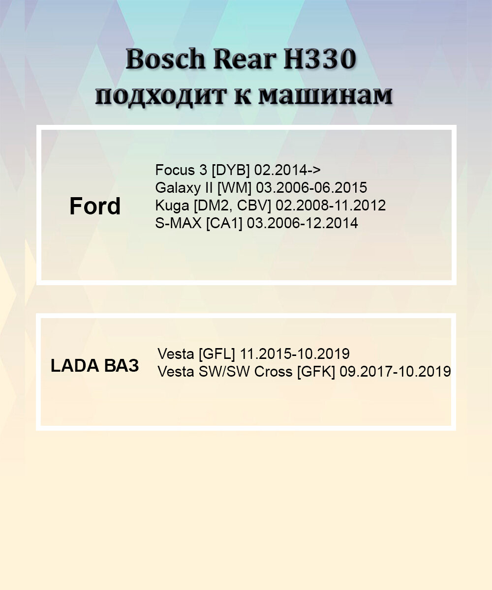 Bosch Rear - серия классических щеток стеклоочистителя для заднего стекла. Эти щетки могут иметь пластиковый или металлический каркас, крепления могут быть как специализированными так и типа "крючок".