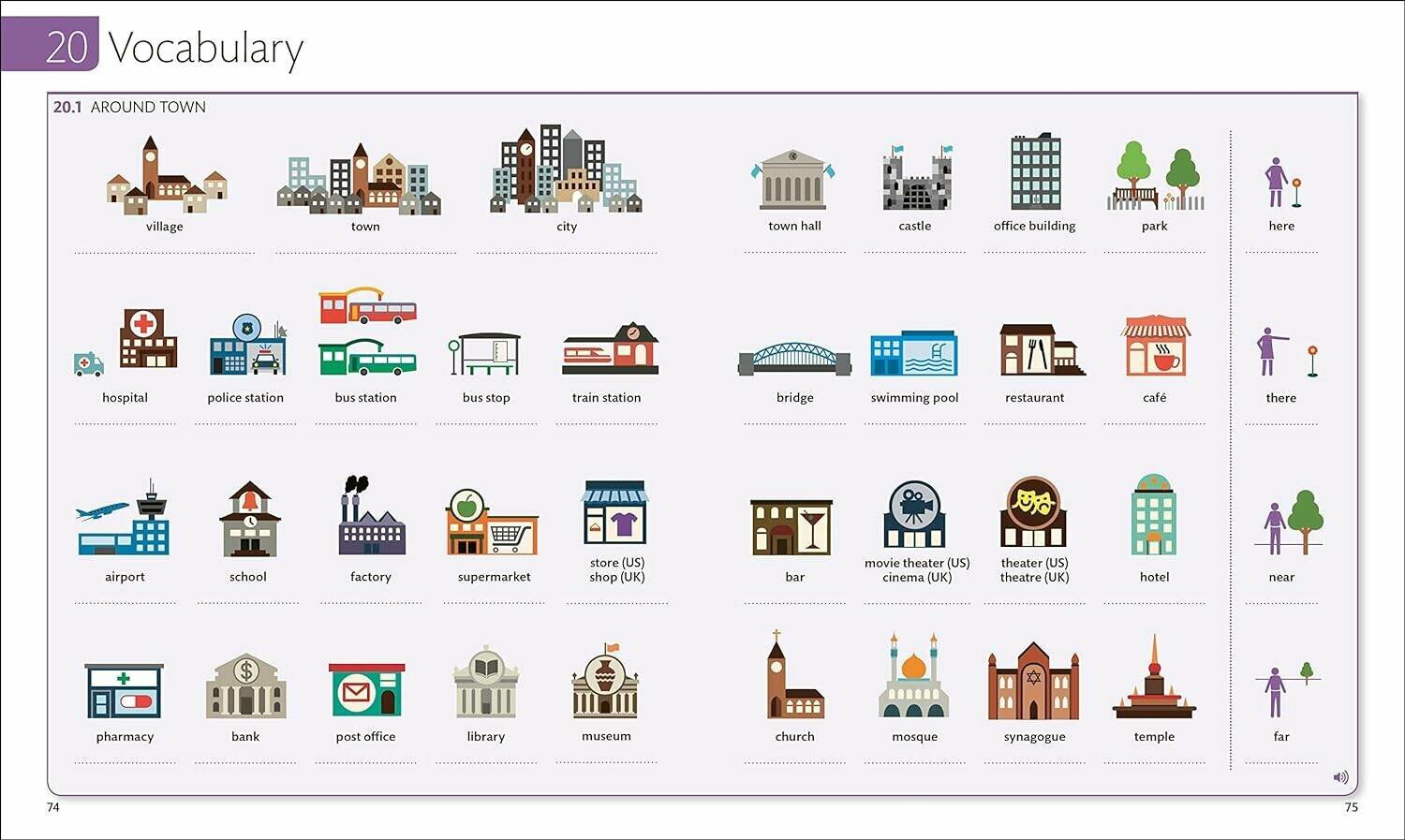 - Visual English vocabulary cues: Lists of useful English words and common phrases with visual aids are available throughout the book