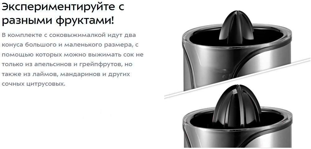 В комплекте с соковыжималкой идут два конуса большого и маленького размера, с помощью которых можно выжимать сок не только из апельсинов и грейпфрутов, но также из лаймов, мандаринов и других сочных цитрусовых.