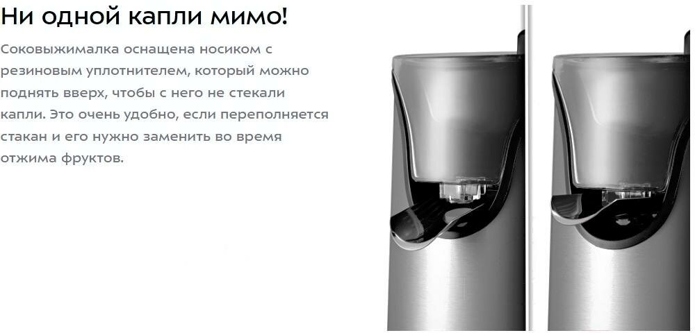 Соковыжималка оснащена носиком с резиновым уплотнителем, который можно поднять вверх, чтобы с него не стекали капли. Это очень удобно, если переполняется стакан и его нужно заменить во время отжима фруктов.