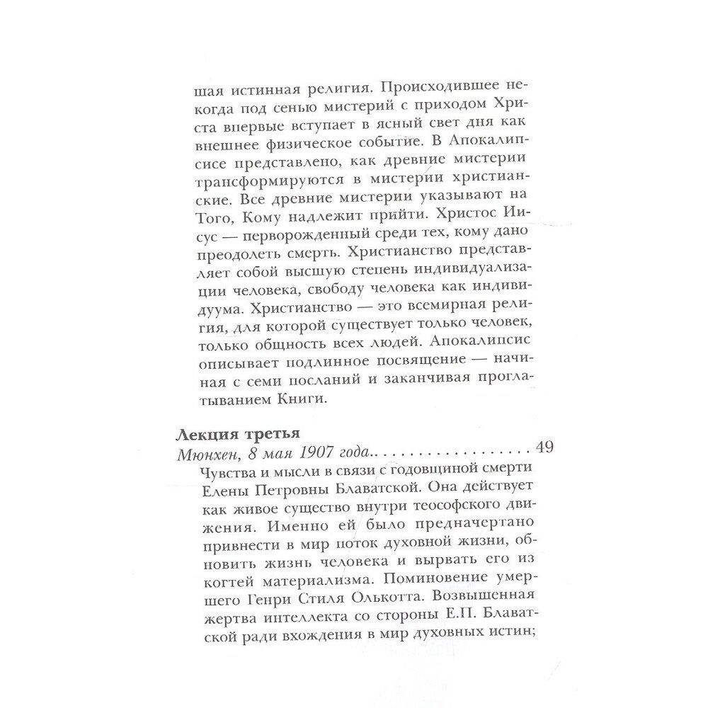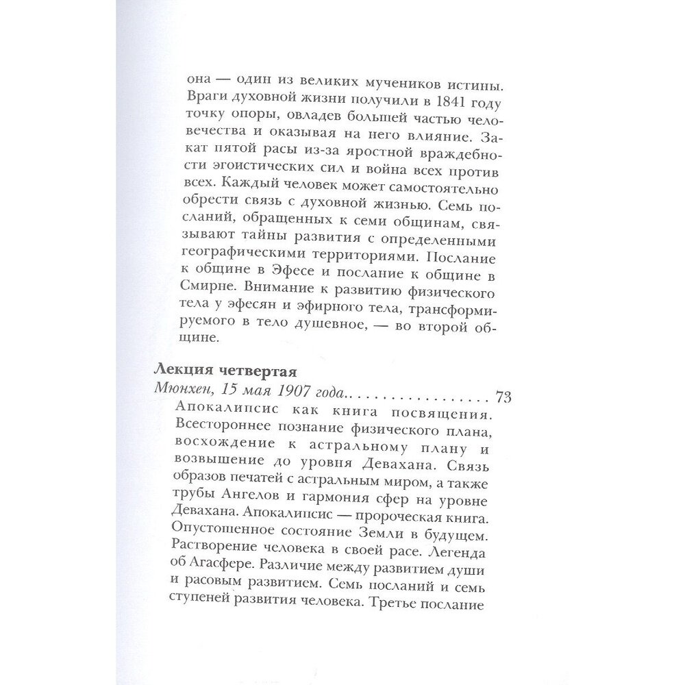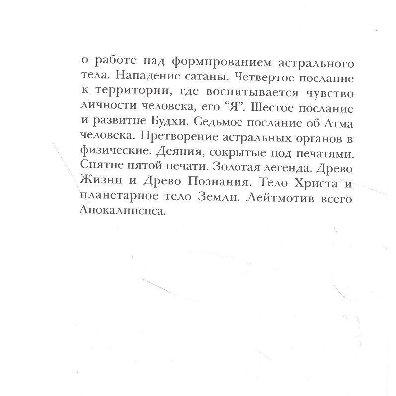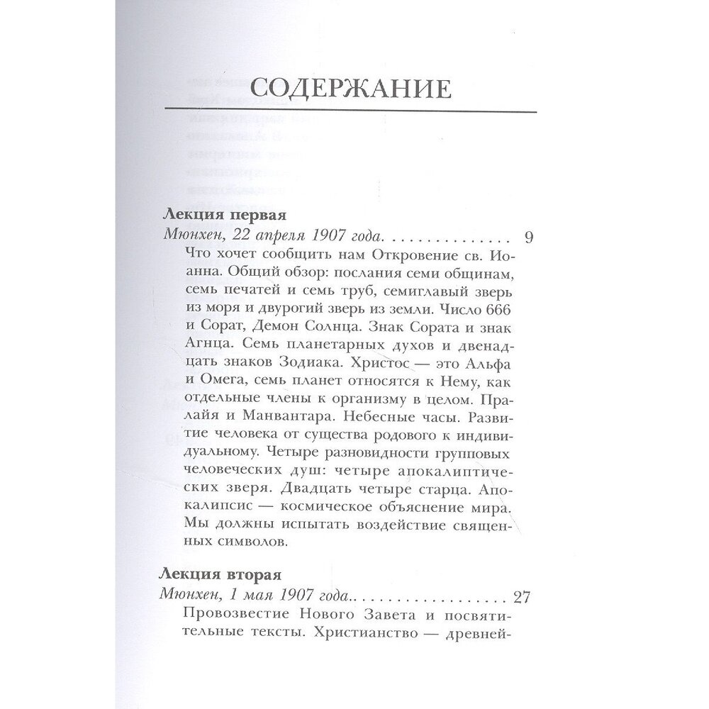 Книга содержит смысловую основу цикла лекций, прочитанного Рудольфом Штайнером в Мюнхене в 1907 году. Этот текст представляет собой не полную запись, а отрывочные заметки слушателей цикла, не проверенные автором. Поэтому данная публикация может служить дополнением к более полной записи курса лекций на ту же тему - "Апокалипсис Св. Иоанна", прочитанного в Нюнберге в 1908 году (см. товары по теме).