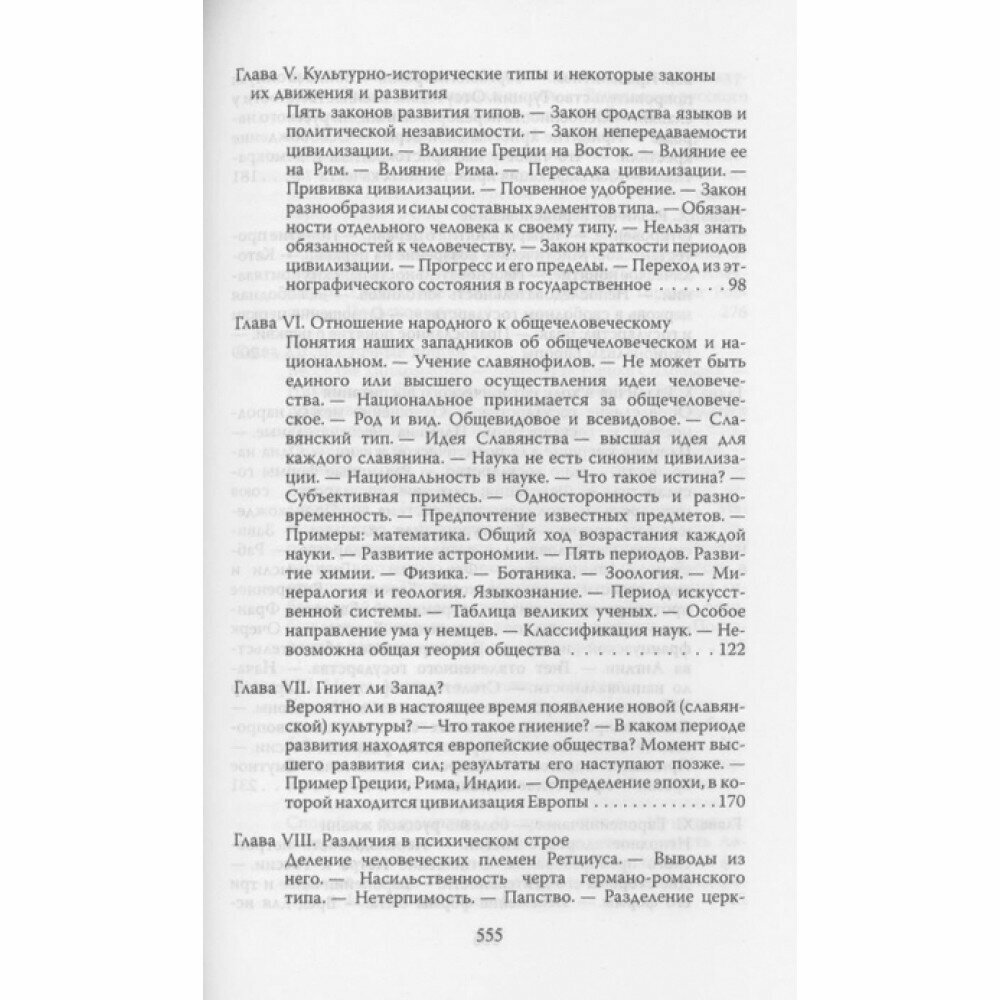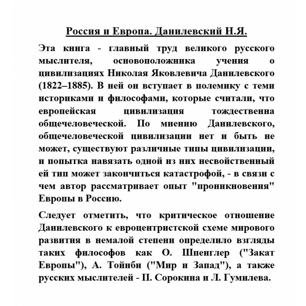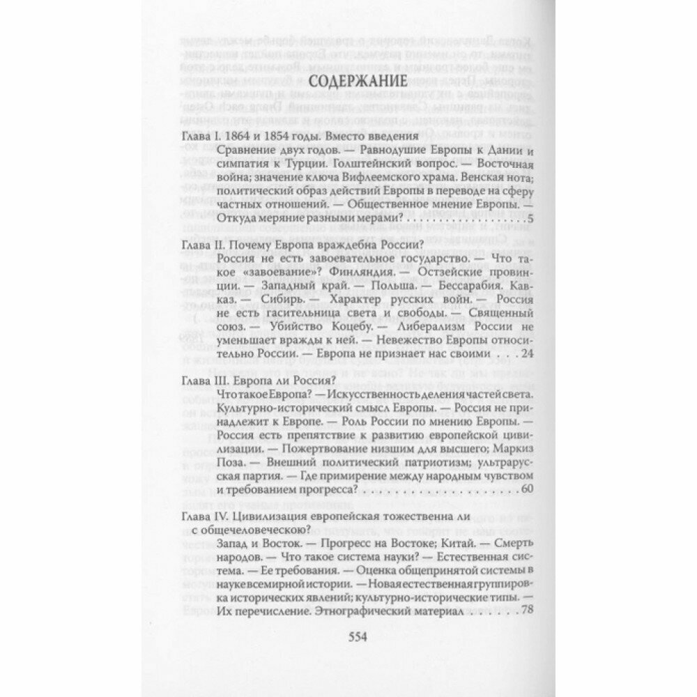 Эта книга - главный труд великого русского мыслителя, основоположника учения о цивилизациях Николая Яковлевича Данилевского (1822 - 1885). В ней он вступает в полемику с теми историками и философами, которые считали, что европейская цивилизация тождественна общечеловеческой. По мнению Данилевского, общечеловеческой цивилизации нет и быть не может, существуют различные типы цивилизации, и попытка навязать одной из них несвойственный ей тип может закончиться катастрофой, - в связи с чем автор рассматривает опыт "проникновения" Европы в Россию.