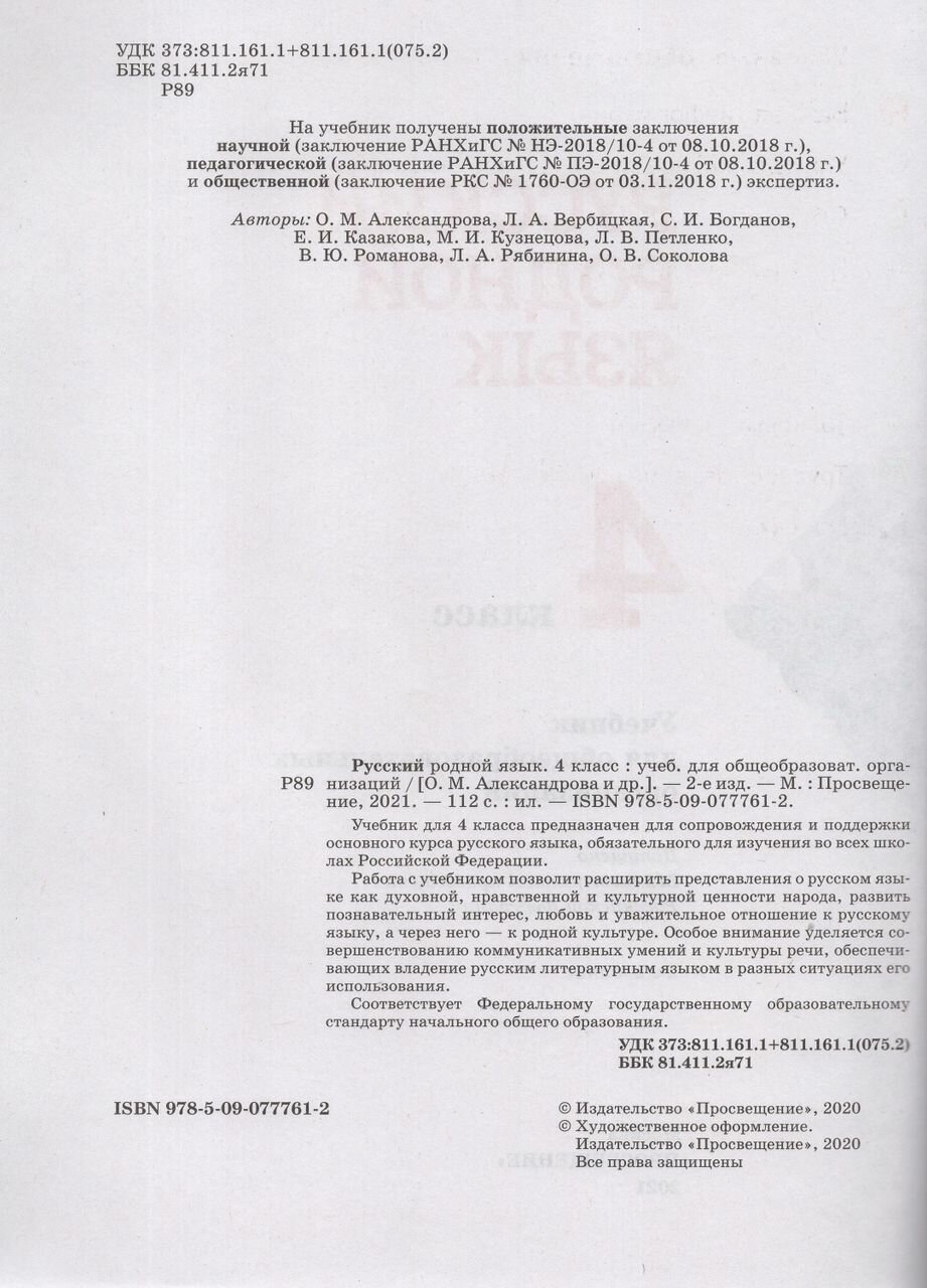Русский родной язык 4 класс Учебник для общеобразовательных организаций (Александрова Ольга Макаровна, Богданов Сергей Игоревич, Вербицкая Людмила Алексеевна, Казакова Елена Ивановна); Просвещение, 2020