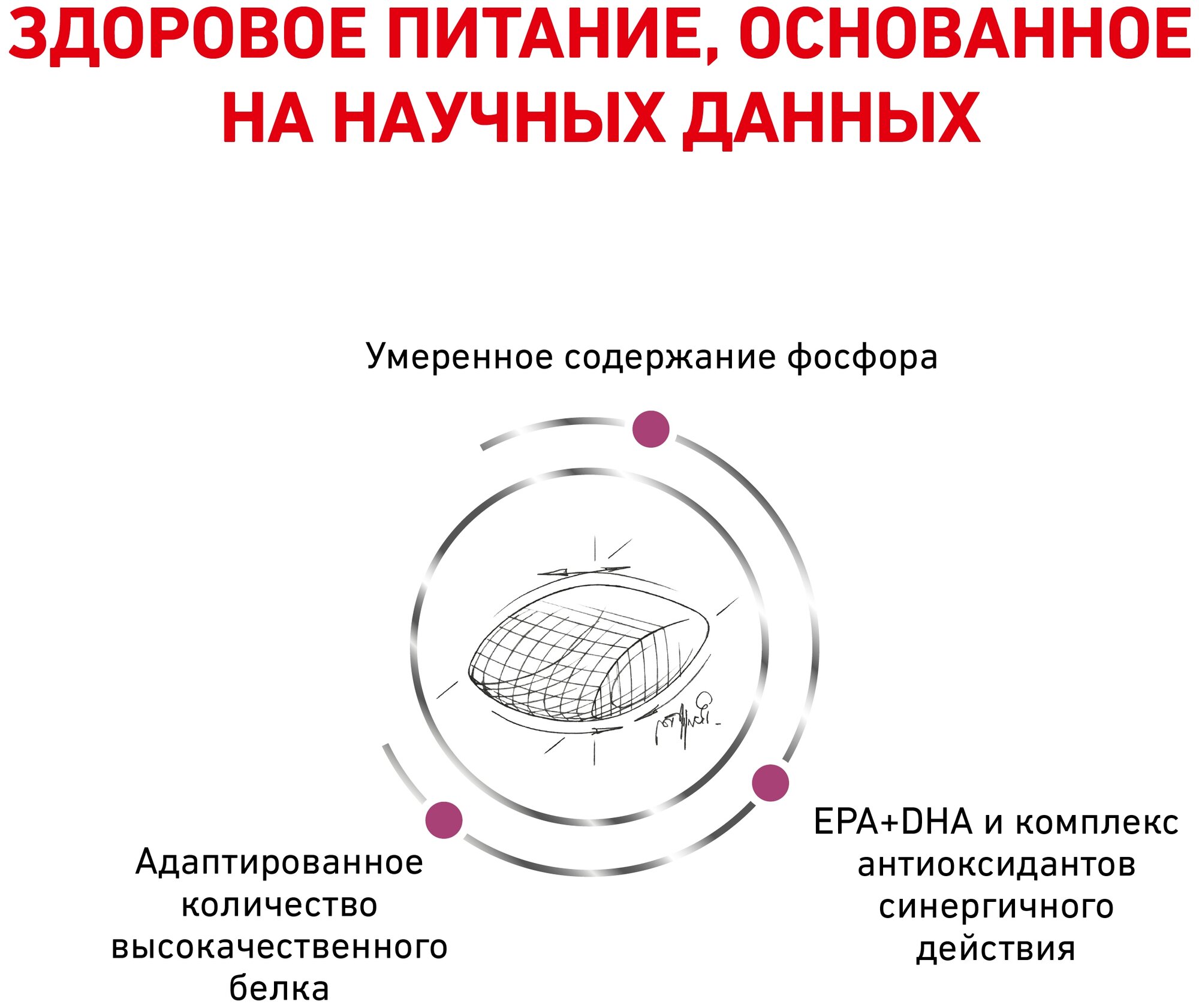 Продукт Royal Canin Early Renal содержит умеренное количество фосфора, а также Омега-3 жирные кислоты EPA, DHA , которые помогаютподдерживать функцию почек при первыхпризнаках недостаточности. Комплекс антиоксидантов в составе корма помогает нейтрализовать свободные радикалыи защитить ткани и клетки от повреждений.