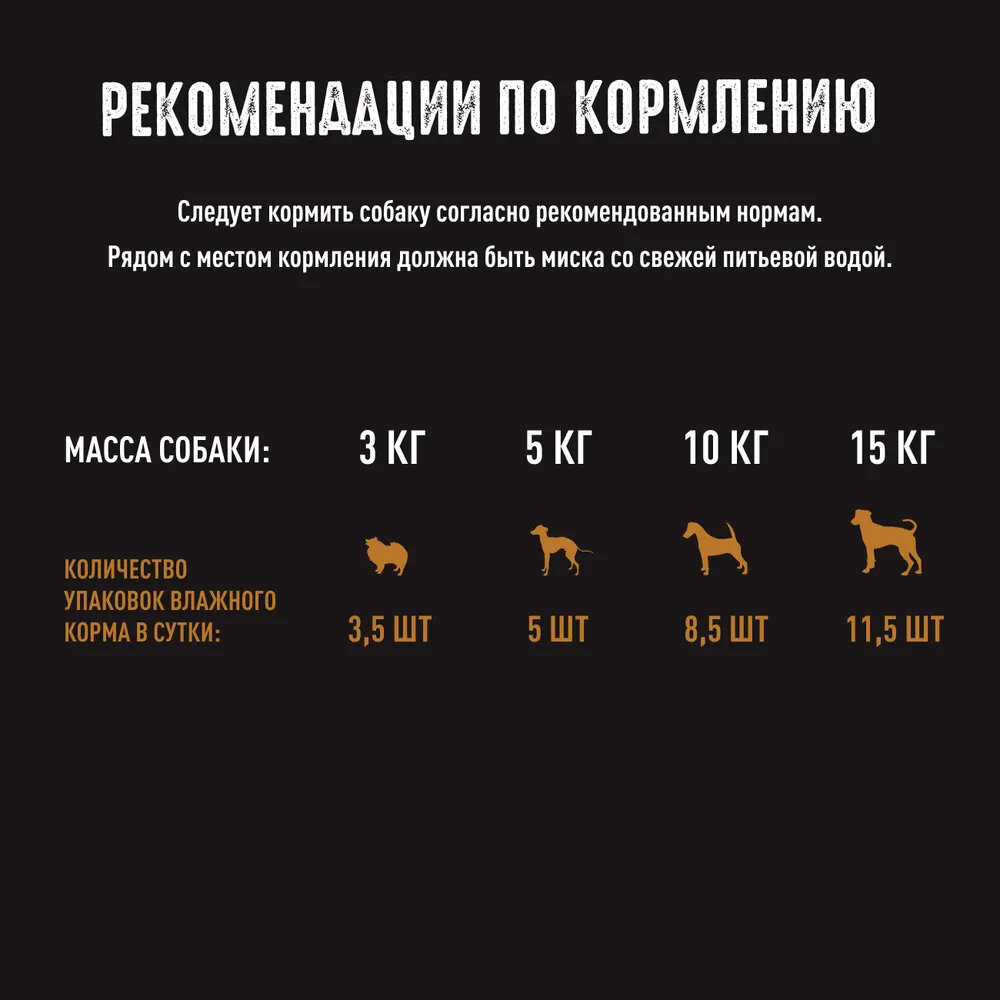 | Рекомендации | Следует кормить собаку согласно рекомендованным кормам. Рядом с местом кормления должна быть миска со свежей питьевой водой. При массе собаки 3 кг рекомендуемое количество упаковок влажного корма в сутки – 3,5 шт. При массе собаки 5 кг рекомендуемое количество упаковок влажного корма в сутки – 5 шт. При массе собаки 10 кг рекомендуемое количество упаковок влажного корма в сутки – 8,5 шт. При массе собаки 15 кг рекомендуемое количество упаковок влажного корма в сутки – 11,5 шт. |