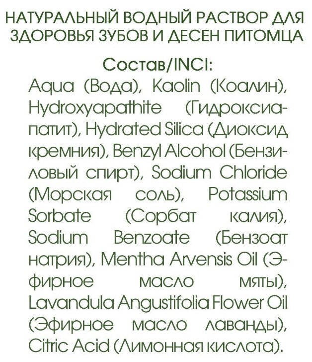Защищает зубы и дёсны питомца, устраняет неприятный запах из пасти. Мягко удаляет налёт, отбеливает и полирует зубки. Регулярное использование помогает обеспечить оптимальное здоровье полости рта питомца. Вследствие натуральности ингредиентов возможно естественное отделение душистых масел и образование осадка, что не влияет на потребительские свойства продукта.