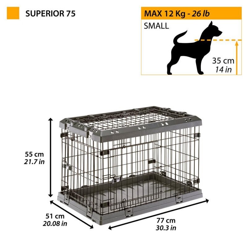 Складная клетка Superior оборудована большими дверцами и даёт возможность использовать её в различных целях как дома, так и на улице. Небольшая модель Superior 60 предоставляет возможность открытия с двух сторон, сбоку и сверху, в то время как модели большего размера можно открыть с 3-х разных сторон: сбоку, сверху и спереди. Кроме того, верхняя часть клетки открывается и снимается. Это очень удобно, поскольку позволяет беспрепятственно погладить собаку, когда вам захочется. Широкие дверки, усиленные замком с двойным предохранителем, позволяют легко добраться до вашего питомца.