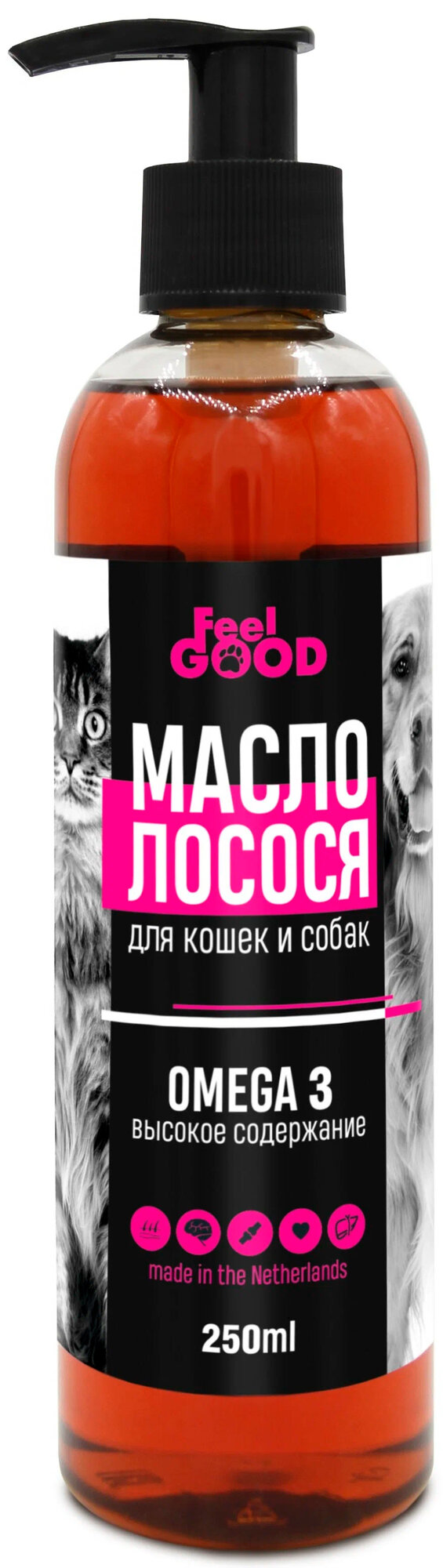 Масло лосося FeelGOOD – это 100% натуральное масло холодного отжима из рыб лососевых пород. Масло имеет высокое содержание незаменимых полиненасыщенных жирных кислот Омега-3. Эти кислоты не синтезируются в организме, поэтому для поддержания здоровья и долголетия домашних животных важно добавлять масло лосося FeelGOOD в ежедневный рацион. Существует мнение, что лососёвое масло - это тот же рыбий жир. Это утверждение в корне неверно. Рыбий жир - это чаще всего выжимка из печени трески. Он богат жирорастворимыми витаминами А и О, которые накапливаются в организме и выводятся крайне медленно. Неконтролируемое потребление витаминов А и О может привести к тяжёлому расстройству организма. Именно по этой причине рыбий жир необходимо принимать исключительно курсами. Лососёвое масло добывается из мяса и субпродуктов лососёвых рыб путём холодного отжима и содержит умеренное количество витаминов А и О, поэтому масло лосося можно добавлять в корм круглогодично. Кроме этого, лососёвое масло, в отличие от рыбьего жира, содержит один из самых сильных антиоксидантов - астаксантин. Антиоксидантная активность астаксантина в несколько раз больше, чем у витамина С и у витамина Е. Этот антиоксидант содержится только в диком лососе, криле, крабах, креветках, а так же в некоторых водорослях. укрепление здоровья эпидермиса и его производных, обеспечение густоты и блеска шерсти; нормализация обменных процессов, стимулирование развития когнитивных способностей и зрения домашнего животного; укрепление и поддержание здоровья суставов, благодаря снижению концентрации воспалительных агентов; профилактика сердечно-сосудистых заболеваний путем снижения уровня триглицеридов в сыворотке крови, особенно липопротеинов низкой плотности; продление жизни животных с хронической болезнью почек благодаря ренопротективной активности Омега-3. Лососевое масло «FeelGOOD» производится из лосося, выловленного в Атлантическом океане. Масло сохраняет все антиоксидантные свойства благодаря тому, что отжим проходит без воздействия химикатов и высоких температур. Масло стабилизировано природным антиоксидантом токоферолом и проходит специальную фильтрацию от диоксинов. Рекомендуется добавлять в корм из расчёта: кошки и собаки до 5 кг - 2 мл суточная норма кошки и собаки 5-10 кг - 4 мл суточная норма собаки 11-23 кг - 8 мл суточная норма собаки 24-47 кг - 12 мл суточная норма собаки более 47 кг - 16 мл суточная норма Одно нажатие на дозатор ~ 2 мл. Состав: 100% масло лосося.