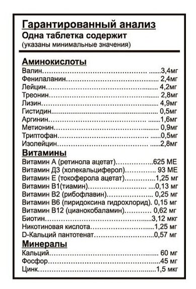 Десять незаменимых аминокислот* не синтезируются самостоятельно организмом собаки, содержатся в комплексе в полном объеме, необходимом для жизнедеятельности.
