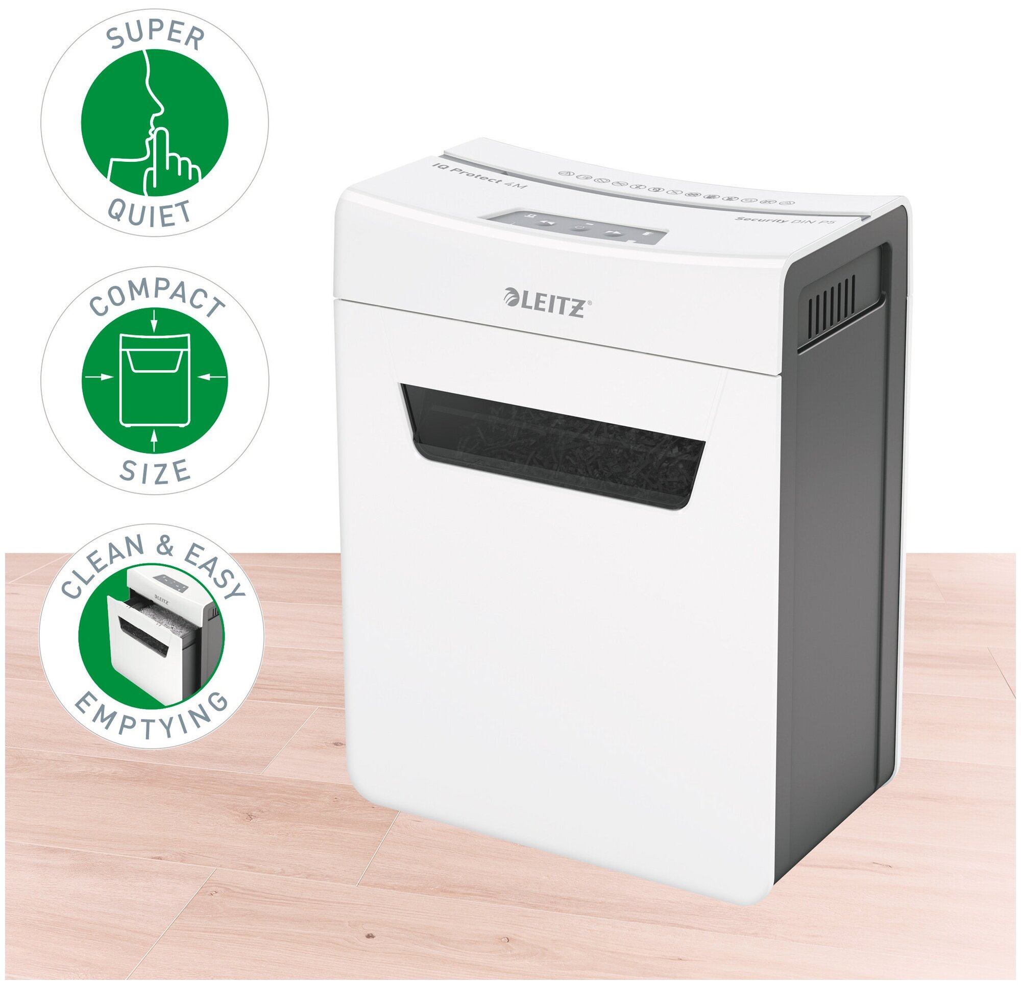 Шредер Leitz IQ PROTECT Premium 4M белый (секр.P-5)/фрагменты/4лист./14лтр./скрепки/скобы