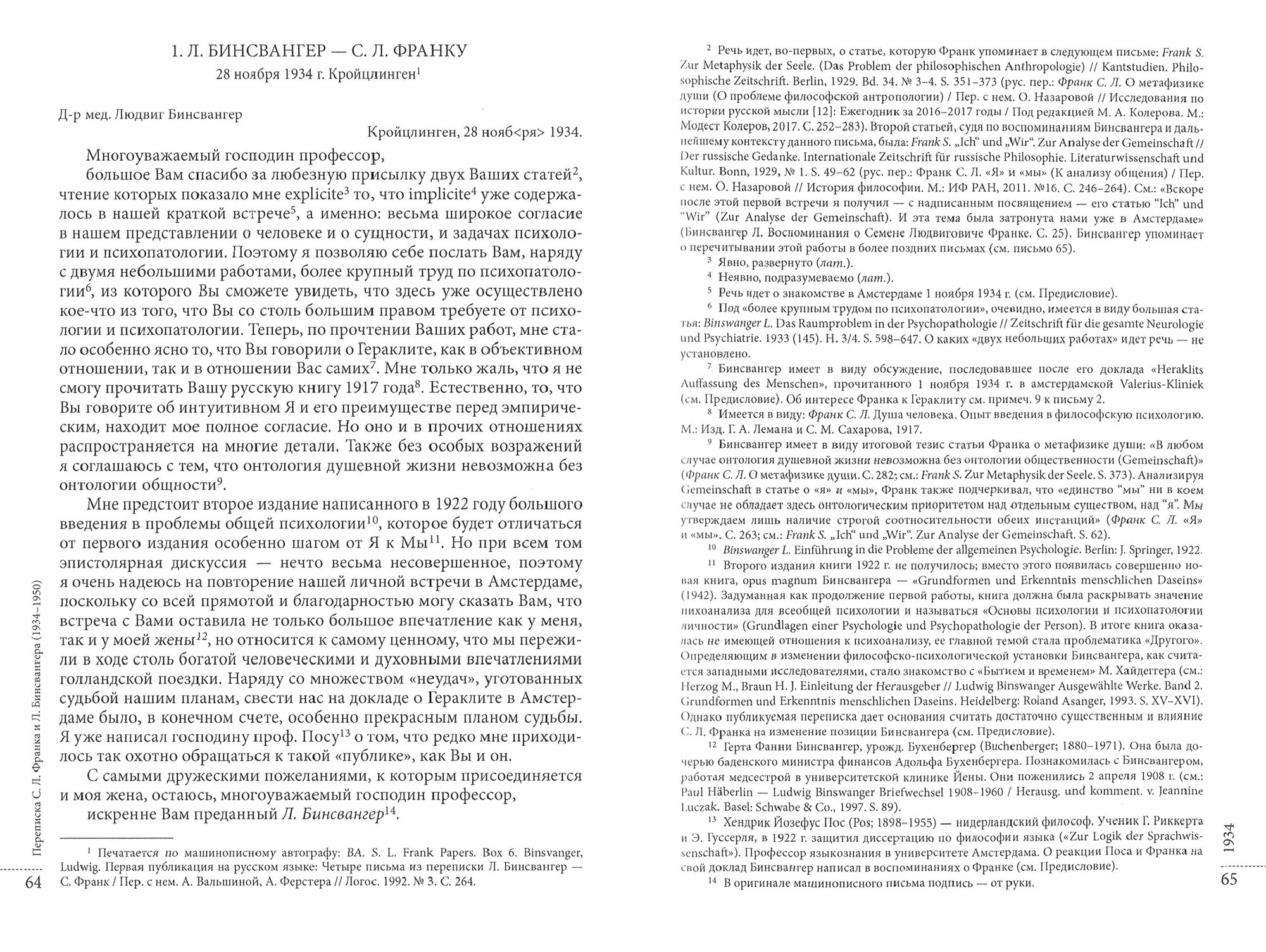 Настоящее издание представляет одно из наиболее значимых документальных свидетельств культурного и философского диалога России и Европы в XX веке - переписку выдающегося русского философа С. Л. Франка и видного деятеля психоаналитического движения, создателя Daseign-анализа, швейцарского психиатра Л. Бинсвангера. Переписка открывает доступ к важным деталям биографии обоих мыслителей, их интеллектуального и духовного общения, круга чтения, а также к их творческой лаборатории, включая работу над такими важнейшими произведениями как "Непостижимое" (и в немецком, и в русском вариантах) Франка и "Grundformen und Erkenntnis menschlichen Daseins" Бинсвангера. Помимо писем основных корреспондентов данная публикация включает ряд важных сопутствующих документов. Значительная часть документов публикуется впервые. Издание осуществляется по принципу билингвы (на языках оригинала - немецком и французском, и в русском переводе) и сопровождается подробным комментарием и именным указателем.
